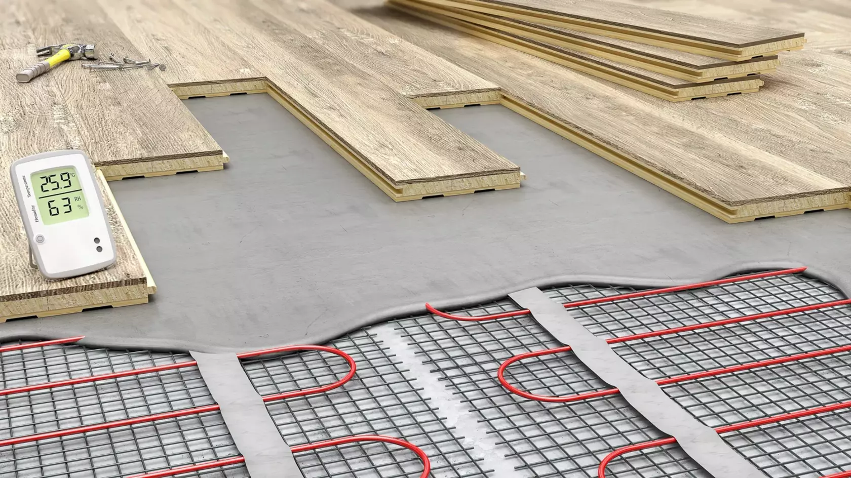 Electric Heating systems set into a screed suitable for use with timber flooring.