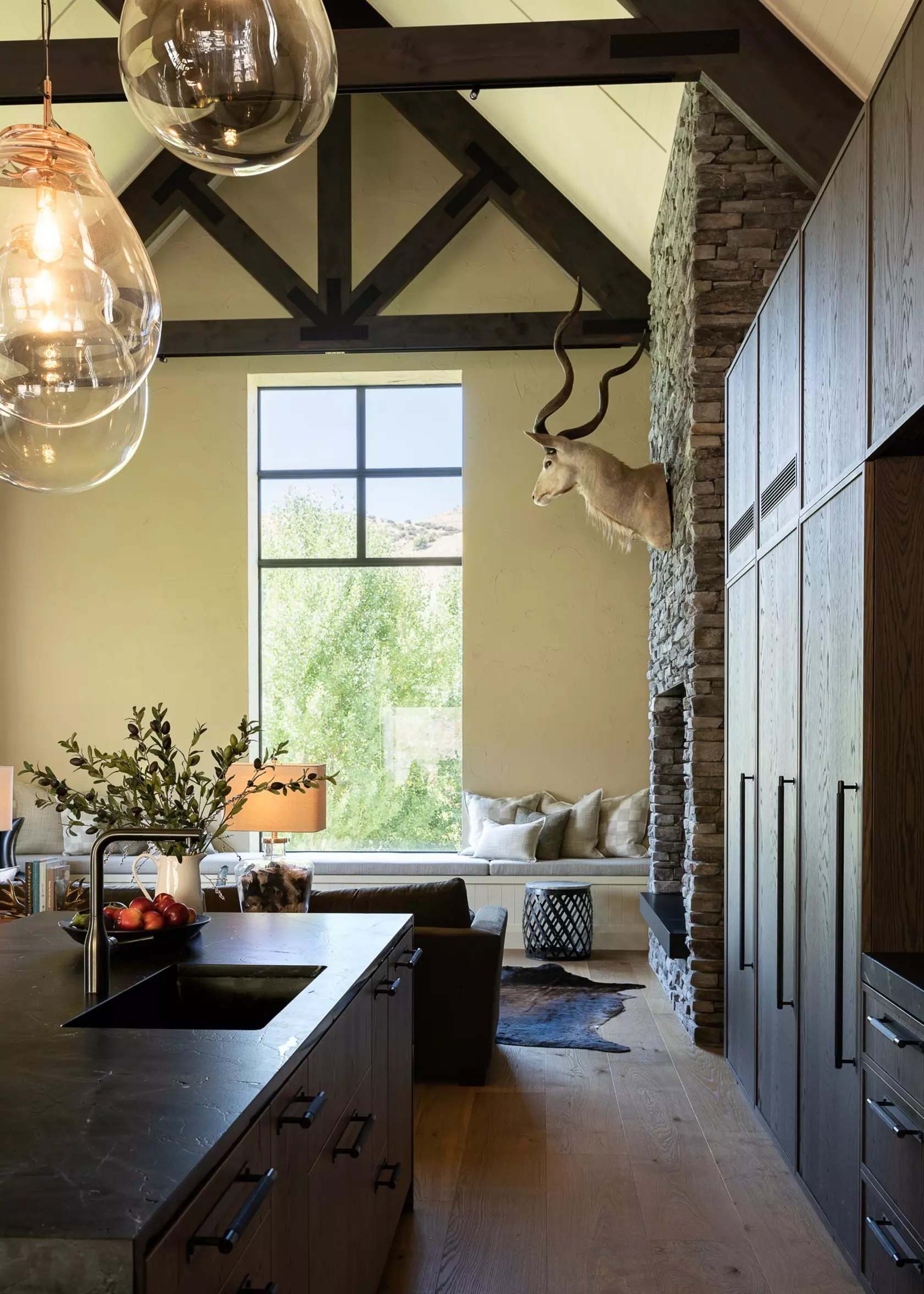 The Two Barns project in Wanaka reflects the traditional alpine style, with rustic timber finishes, cedar barn doors, stone chimney, and board and batten cladding. To ensure the interior complemented this, the dark tones were carried through in blacks and browns.