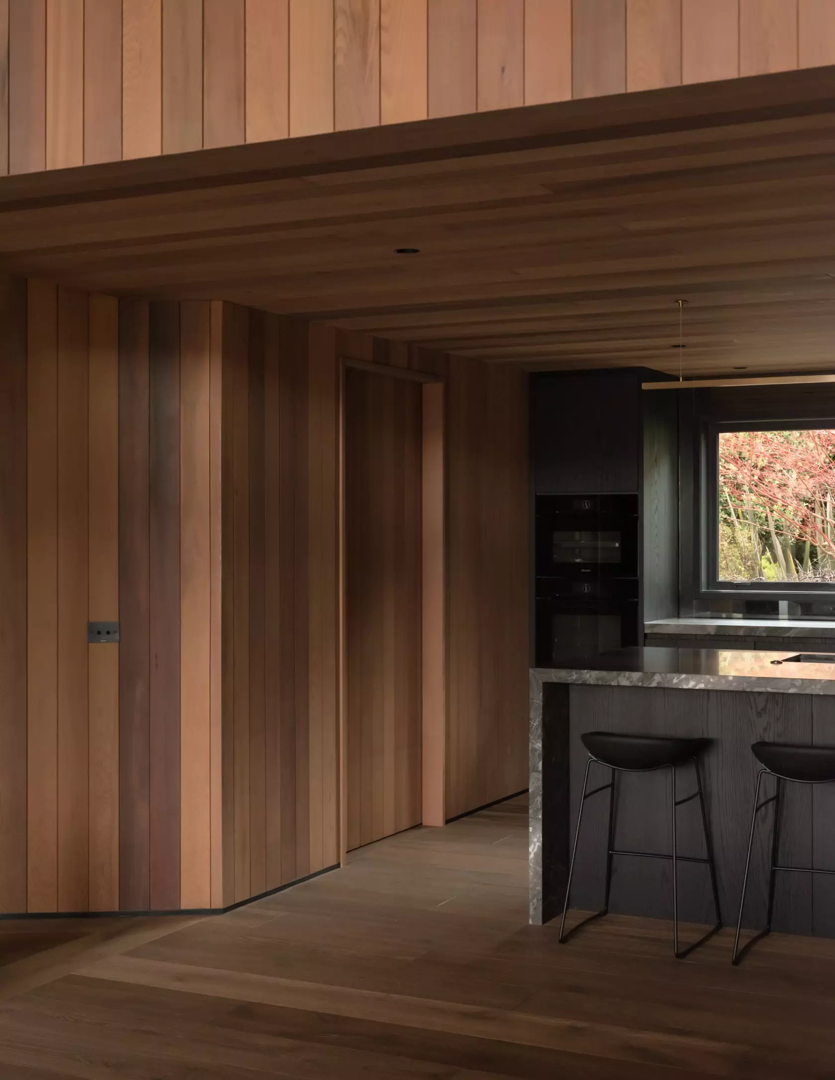An update on 2024’s colour drenching trend (where a single paint colour is applied consistently throughout a space), wood drenching uses a combination timber paneling and flooring to ‘wrap’ a room – creating a cohesive, cocoon-like atmosphere. Leaning into current interior trends for 1970s aesthetics, wood drenching offers a touch of nostalgia while adding warmth, texture and visual impact.