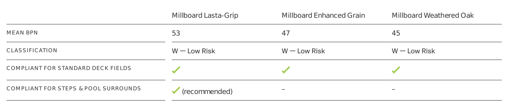 Millboard is the only decking product available in the New Zealand market with NATA-accredited slip resistance test reports prepared specifically for local conditions, under AS/NZS 4586:2004. That distinction matters at consent stage, at handover, and for the lifetime of the installation.