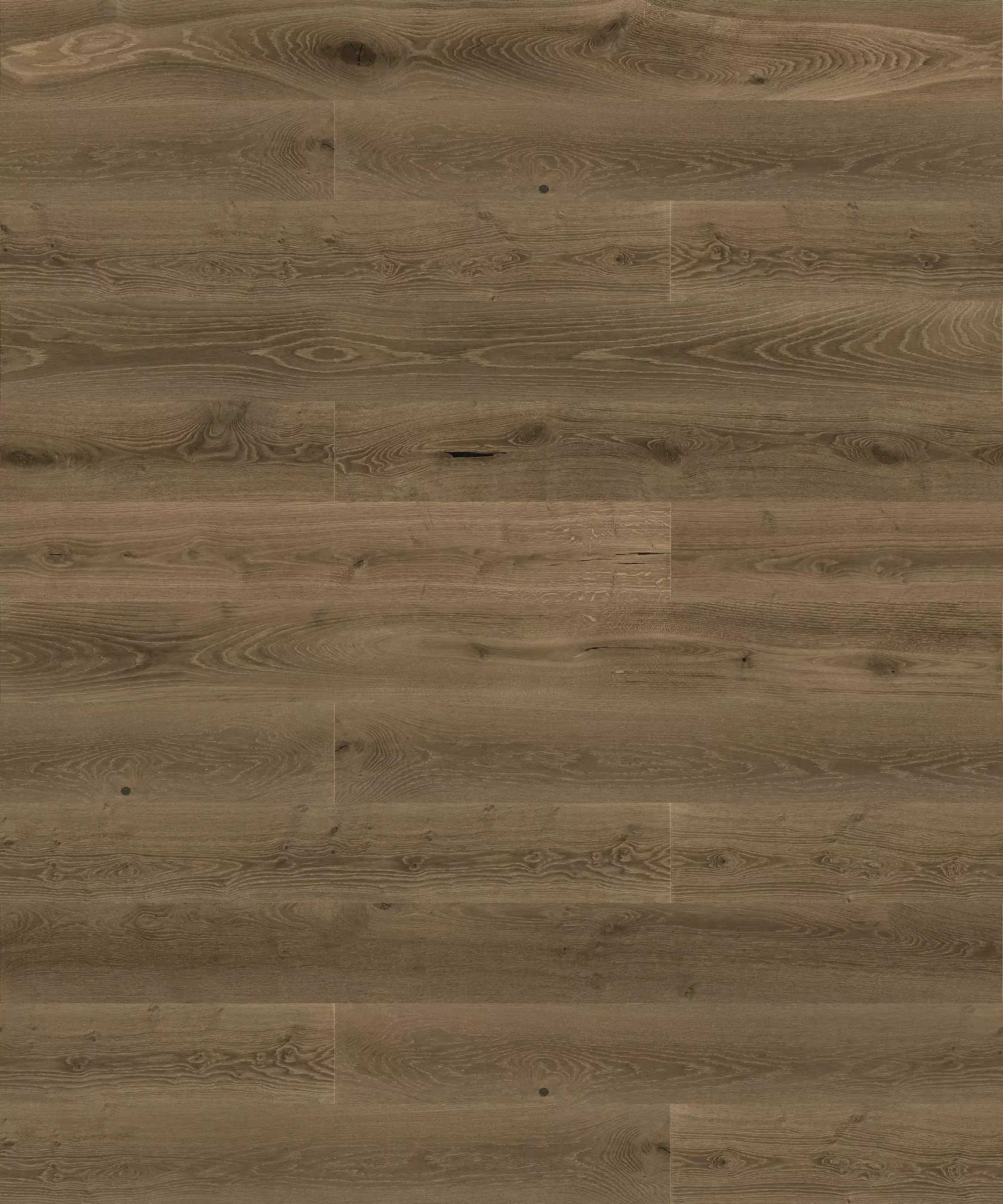 An aged, deep-brown European Oak in an extra-wide plank, Atelier Classic pairs knots and character with a brushed texture and ageing stain.