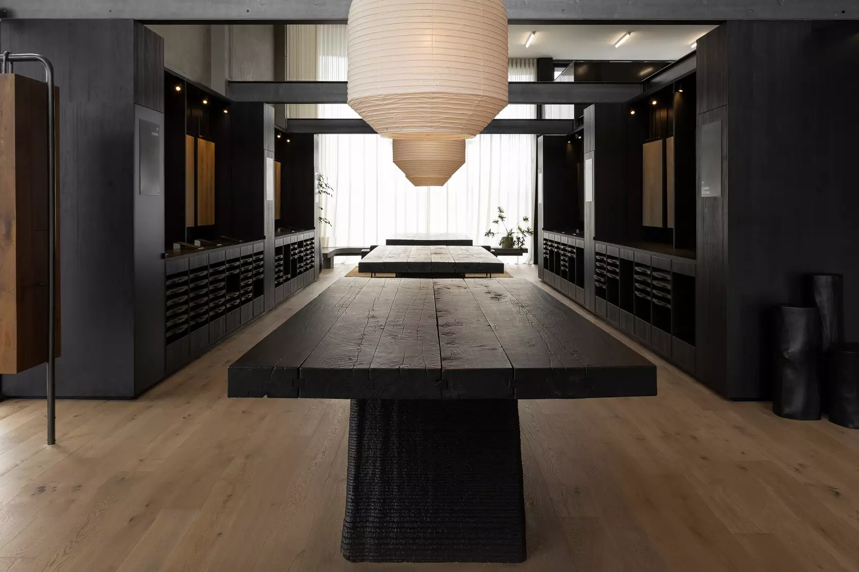 Full range of product on display (timber flooring, interior panelling, veneer panels, exterior decking and cladding)