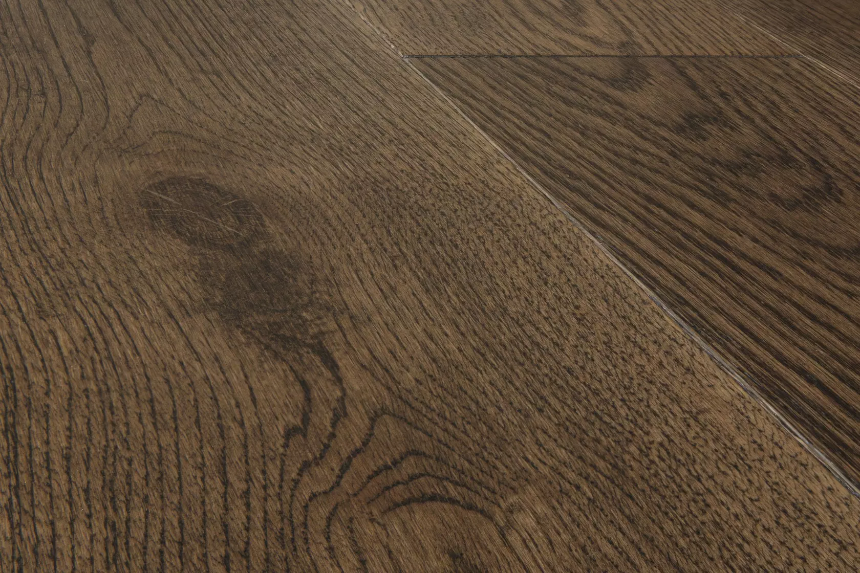 A deep, rich brown European Oak in a standard plank, Harlem pairs knots and character with an extra lightly brushed texture.