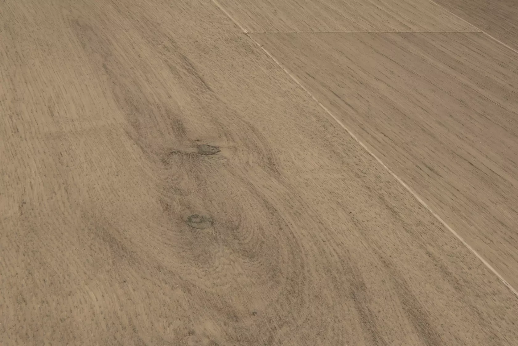 A light, grey-beige European Oak in a standard plank, Manhattan pairs knots and character with an extra lightly brushed texture.