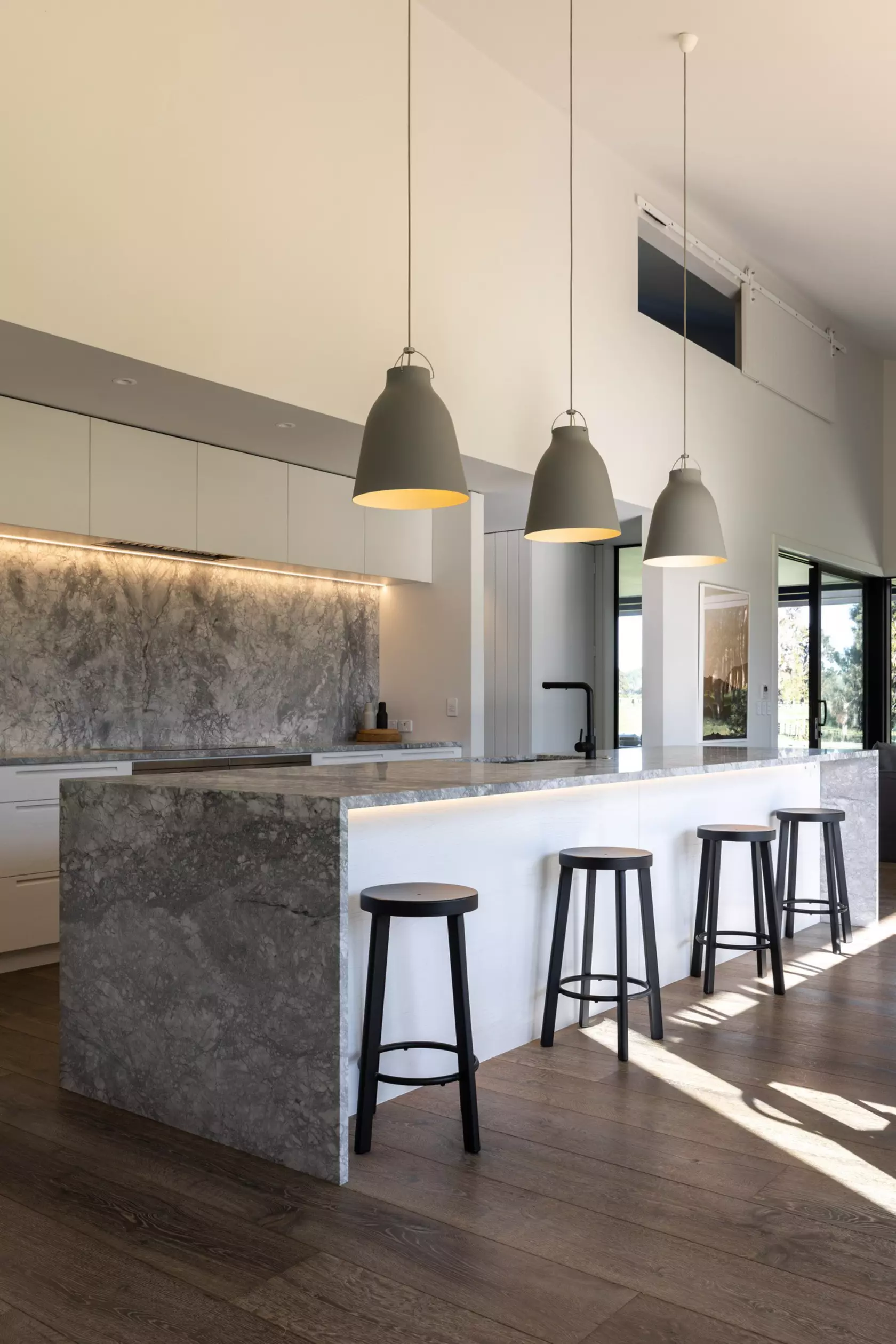 The feminine and refined interior is a stark contrast to the bold exterior. The kitchen boasts a sophisticated palette and includes a grainy stone waterfall benchtop and matching splashback which add a touch of strength to the soft appearance of the sandblasted white oak cabinetry.