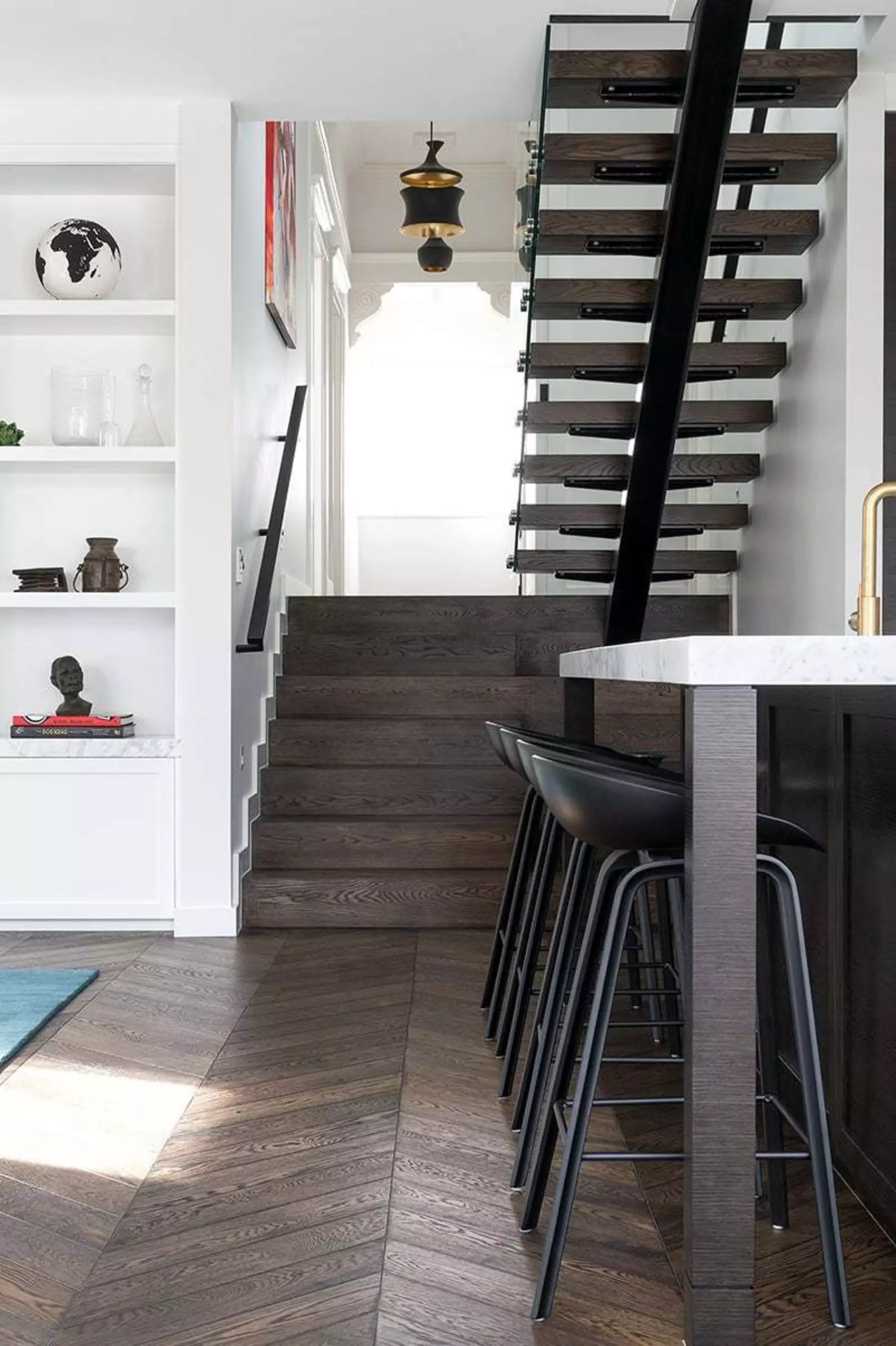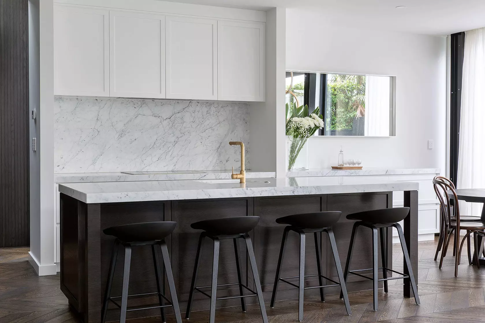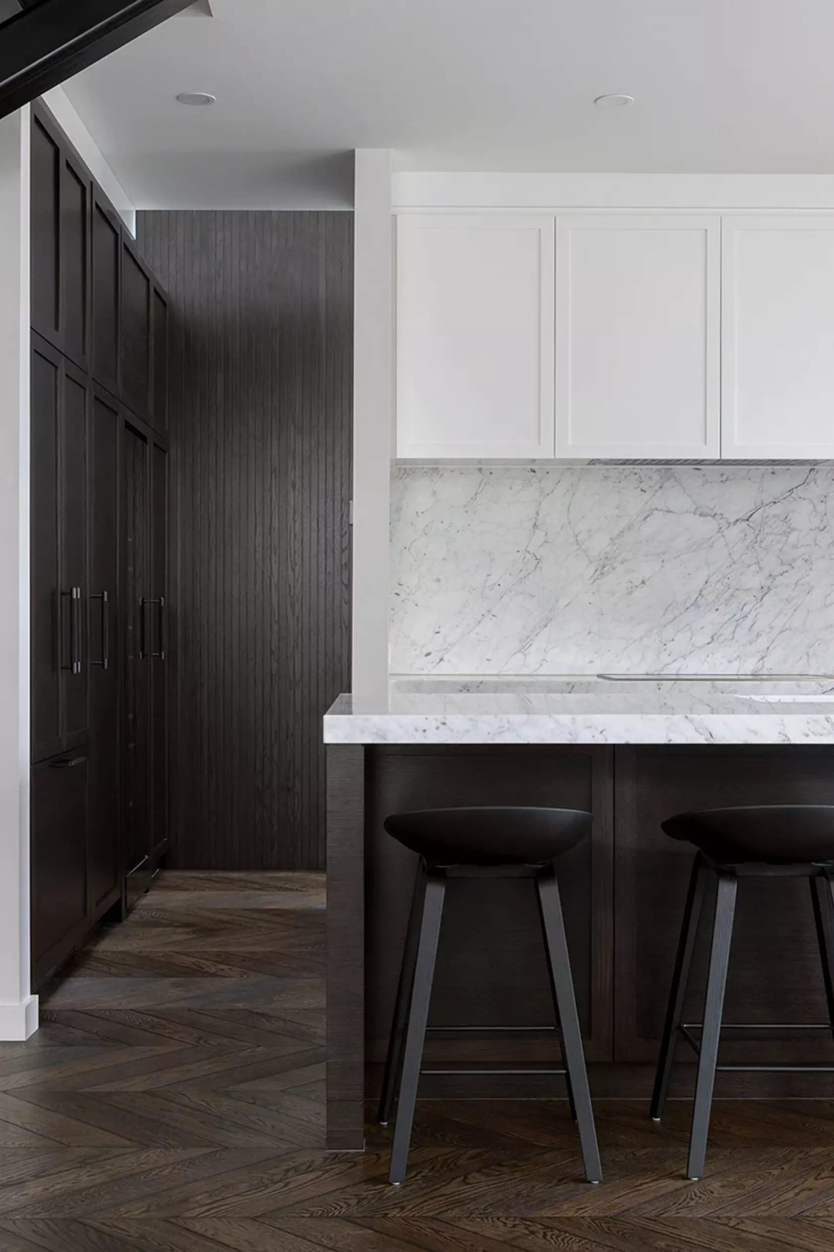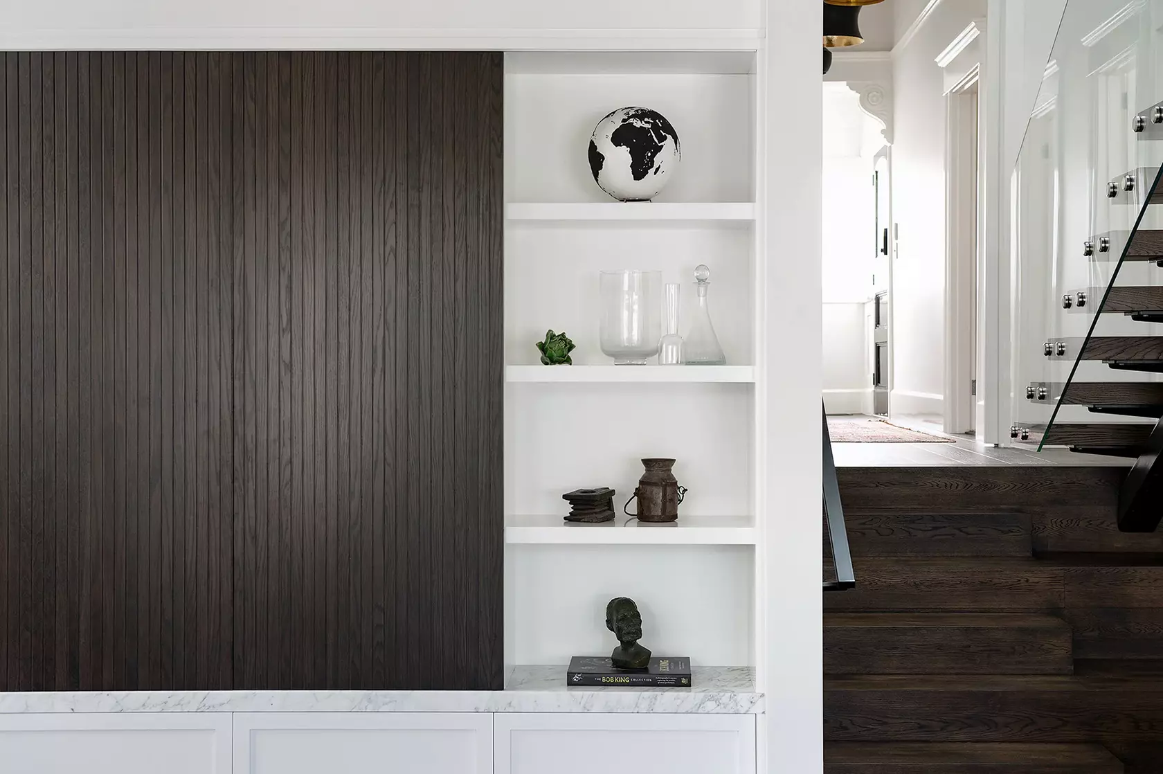 This interior explores the beauty of contrast—where classic meets contemporary, and weight balances softness. Custom chevron flooring by Forté establishes the foundation, its linear rhythm echoing the battens and architectural detailing that define the space. Framed-door cabinetry sits alongside natural stone and textured fibres, creating a layered environment where traditional forms and modern materiality work in harmony.