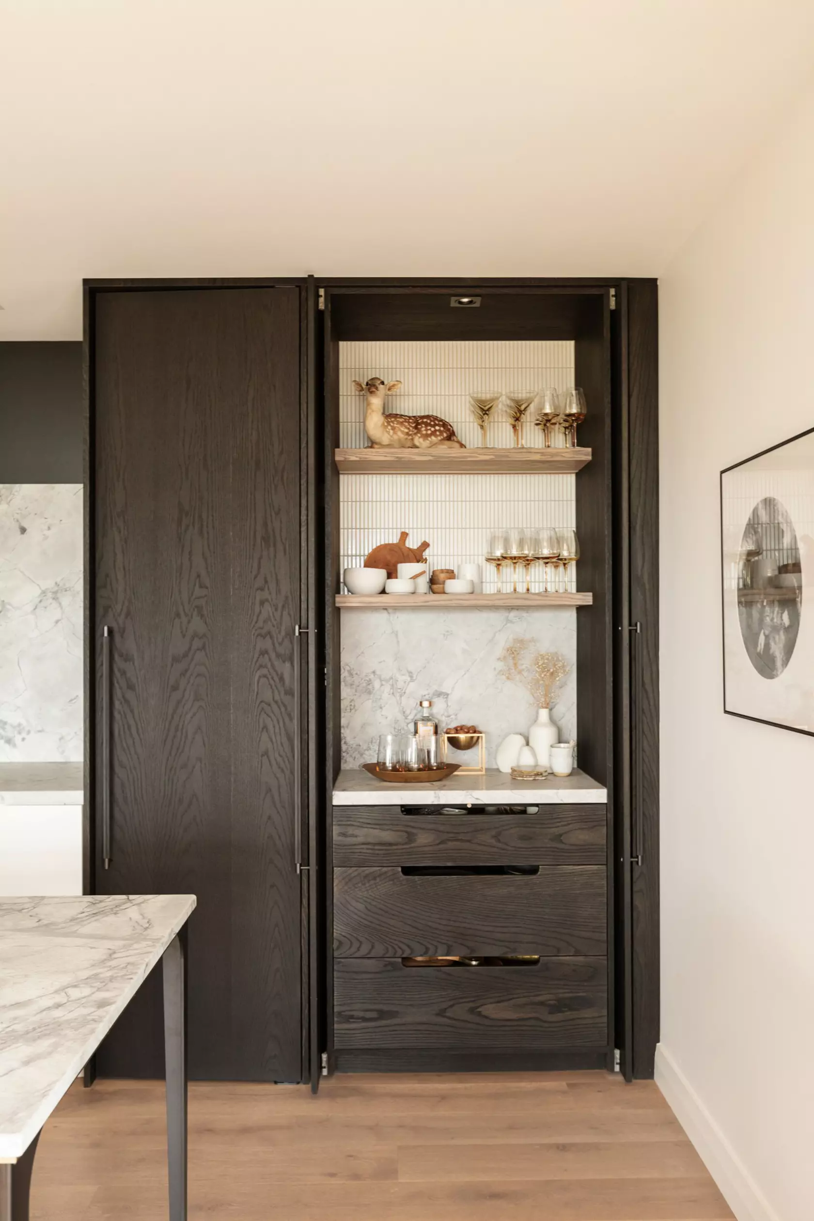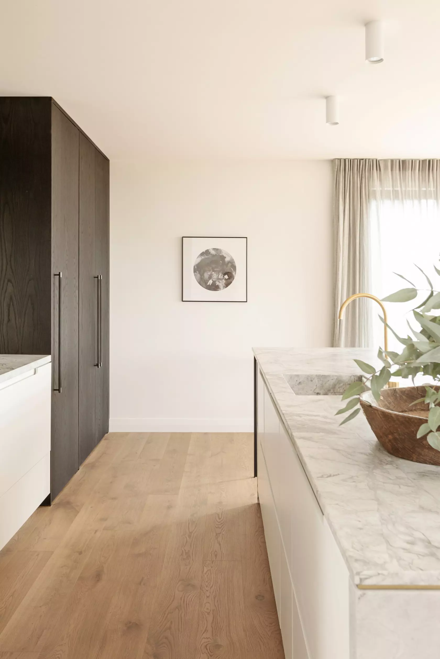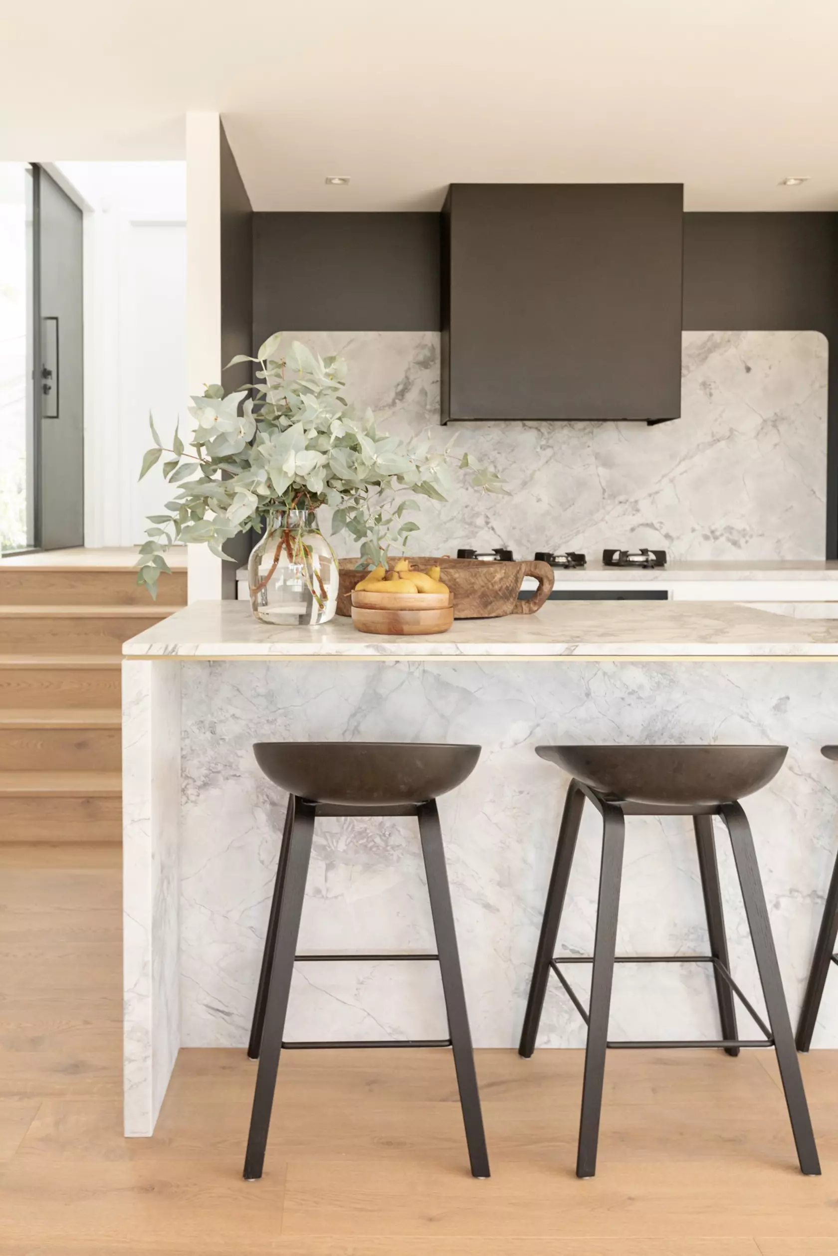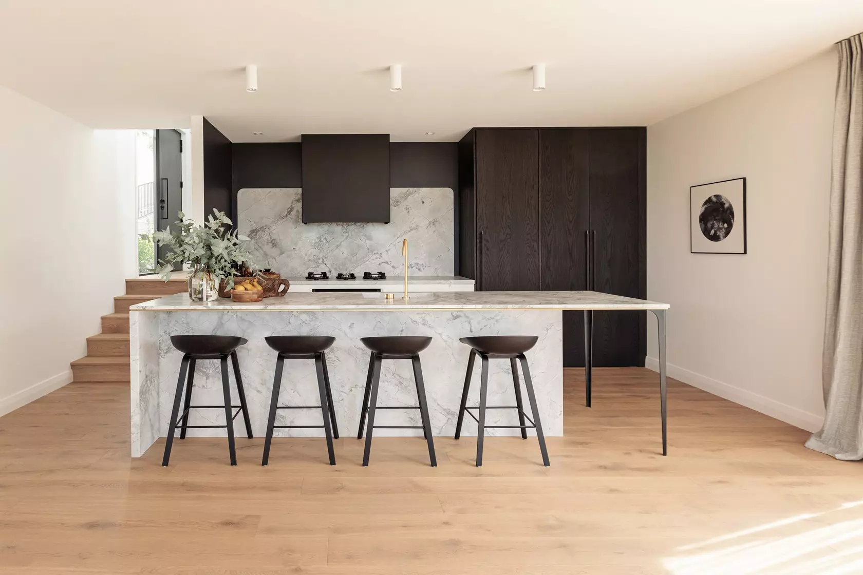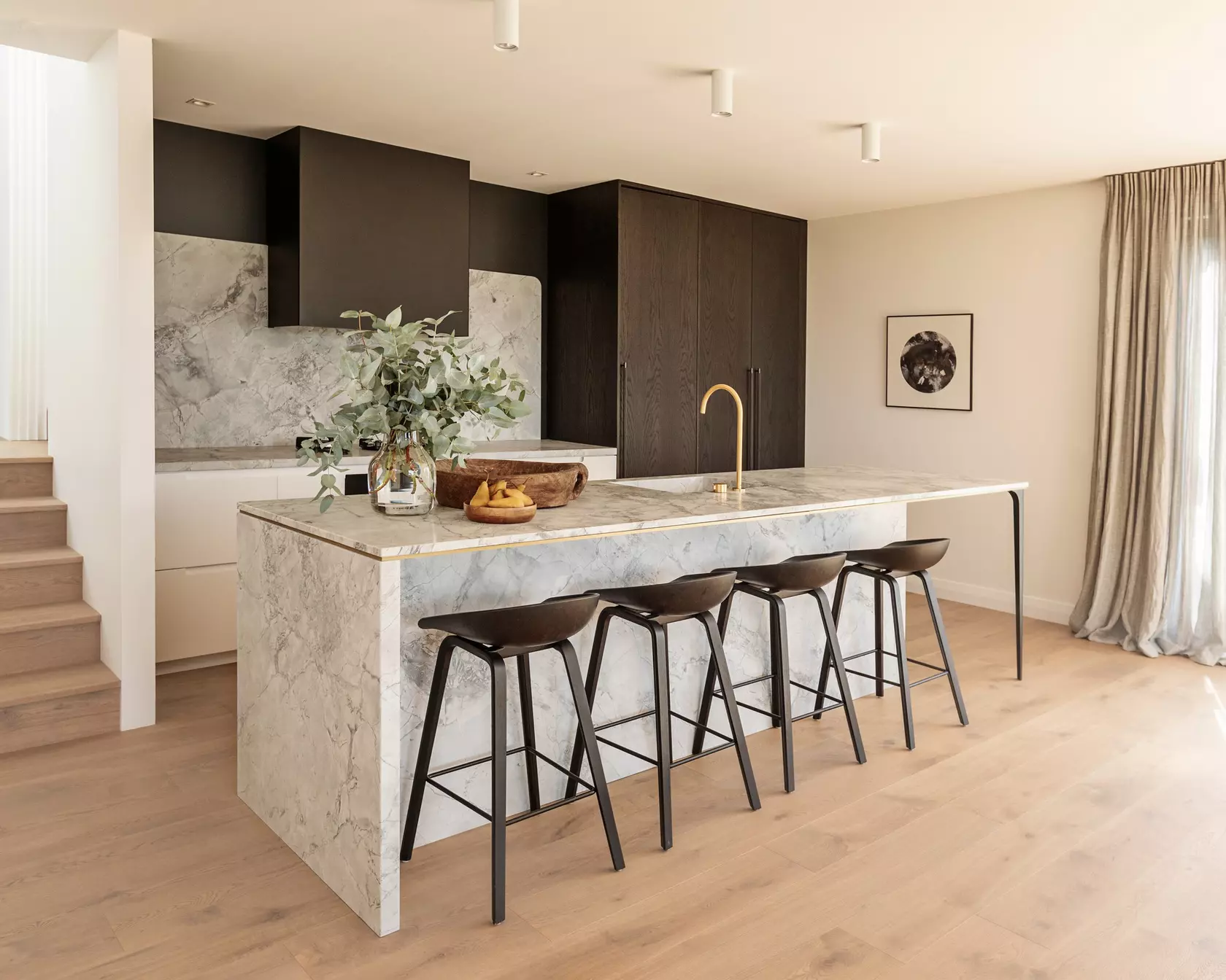 Marble countertops and kitchen splashbacks, gold tapware, dark wood cabinetry, black metal furnishings and the muted sandy-brown tones of Moda Altro Verona give the interior a sophisticated contemporary feel.