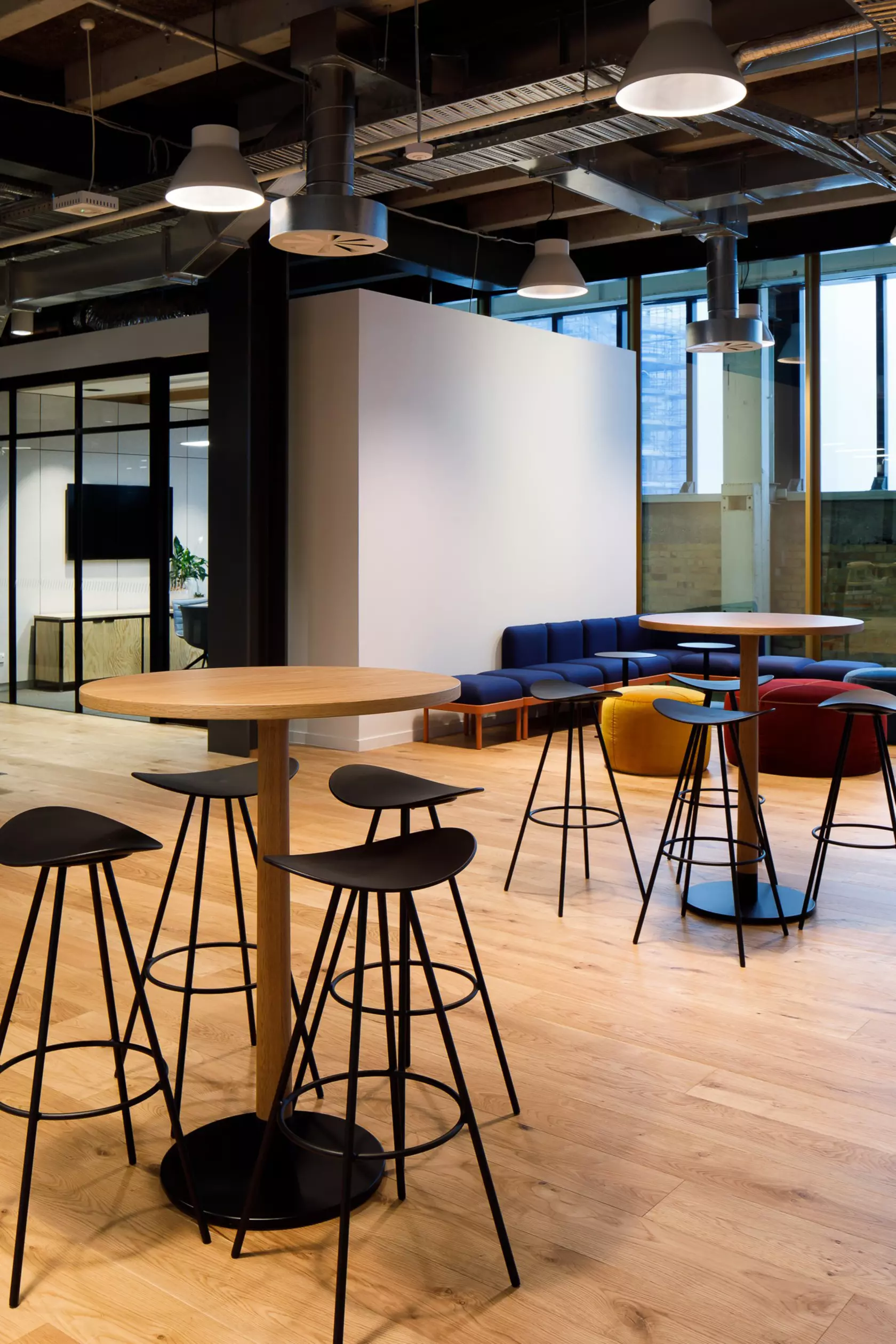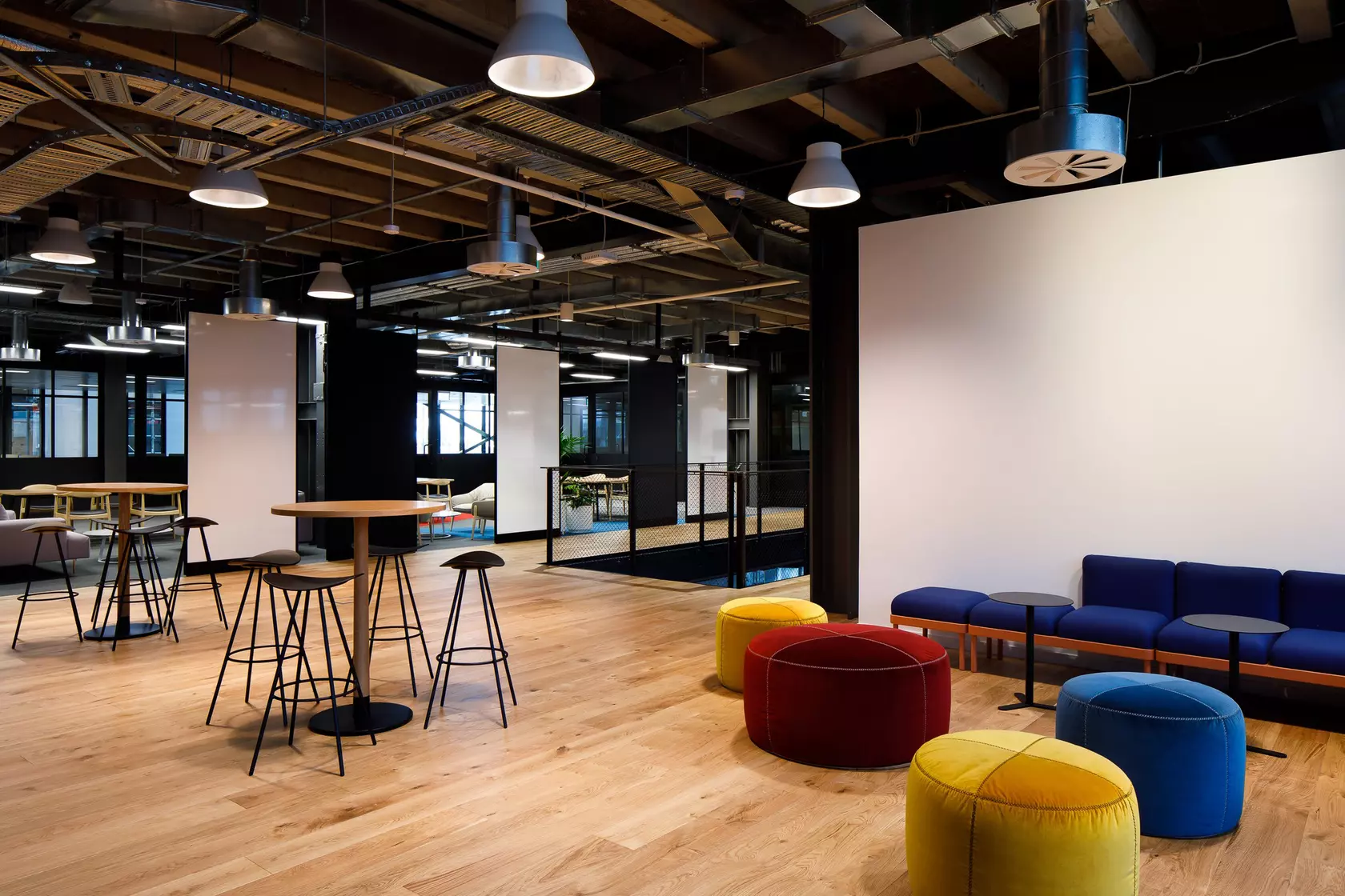 From the exterior, modern glass and dark-clad structures have been incorporated into the classic brick façade, while throughout the office, a blend of modern and soft features meets brick and steel fixtures.