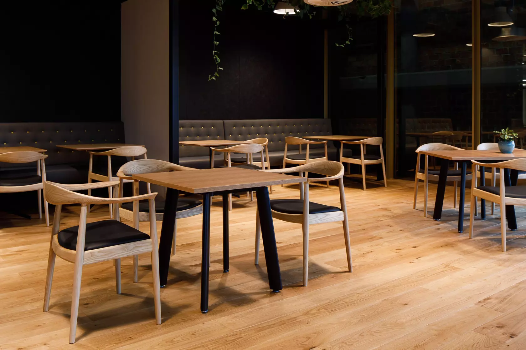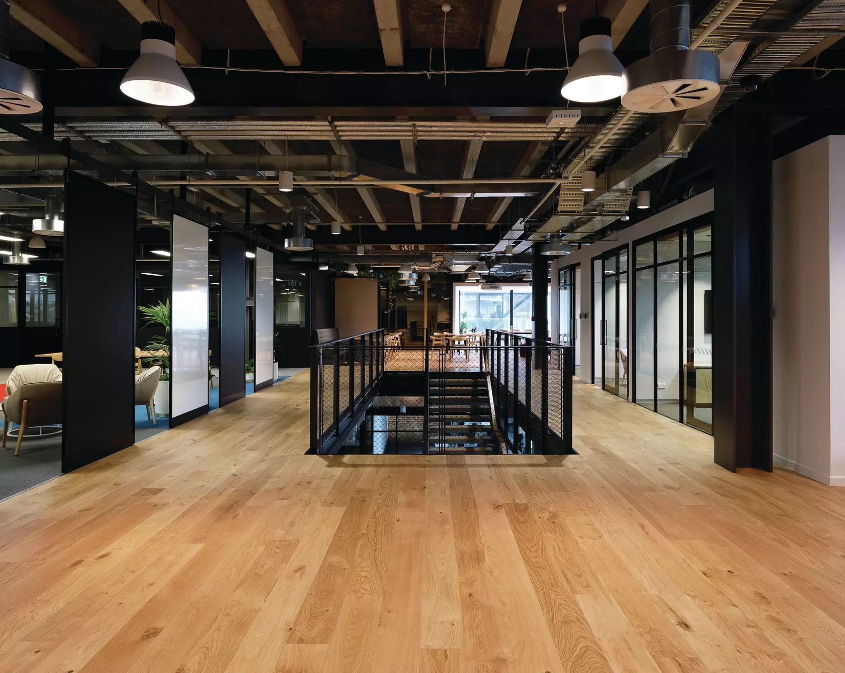 Smartfloor Natural Oak Feature engineered wood flooring by Forté has been laid on the upper level, wrapping around the main landing and through to the seating areas. The golden oak and lightly brushed planks add a natural element and character to the space.