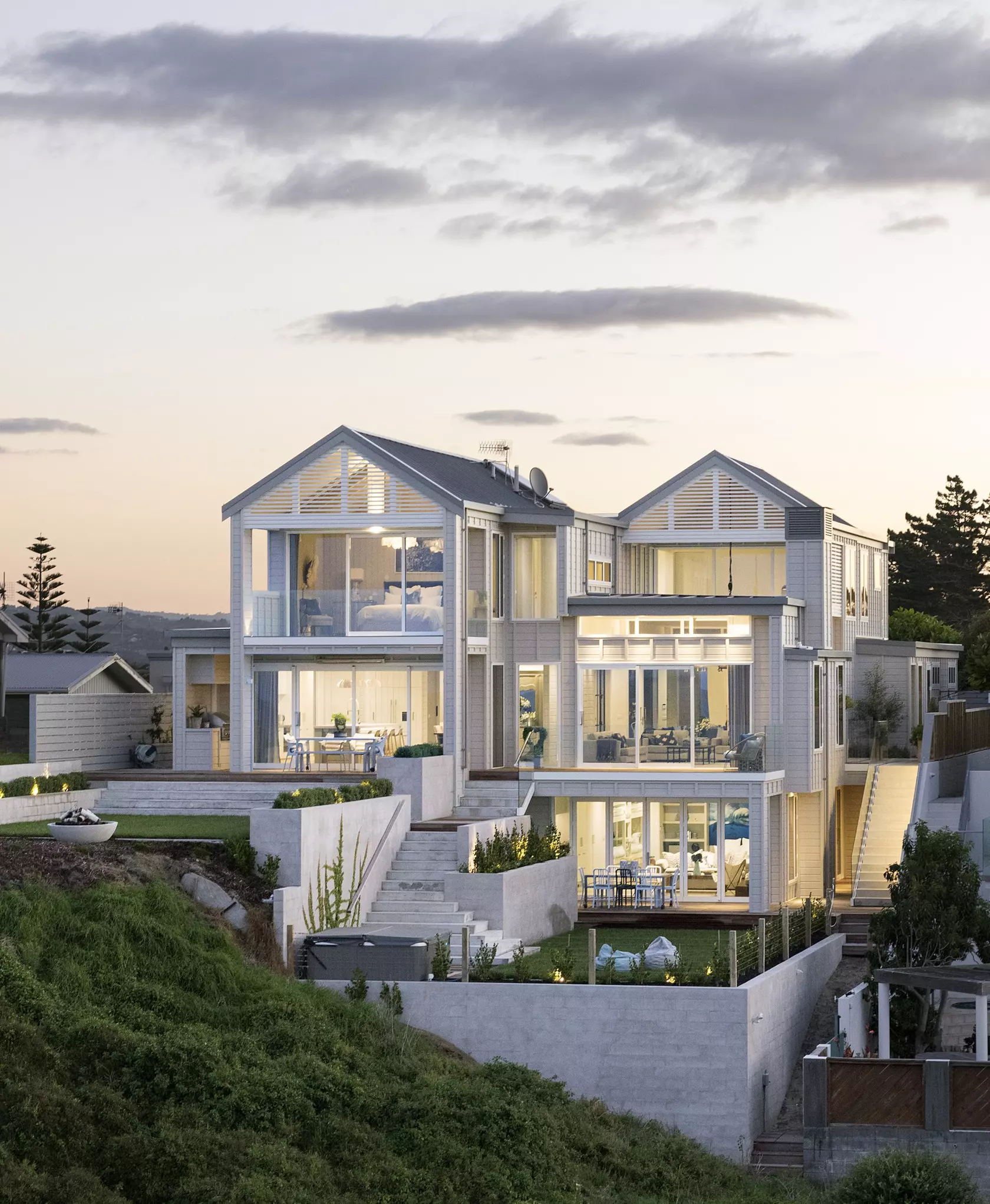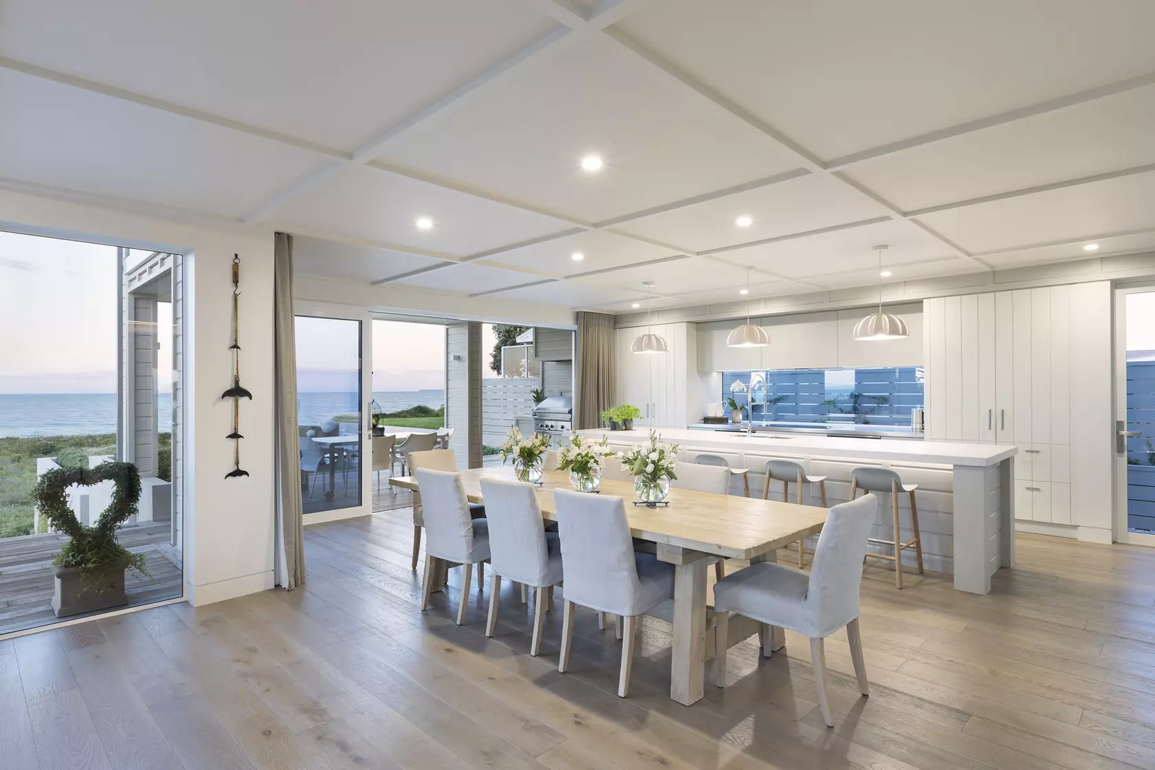 Band-sawn cedar and natural oak define this expansive Mount Maunganui beach house, where texture and materiality anchor a 465-square-metre home designed for coastal family living. Forté's Smartfloor Sandstone Oak flooring establishes a warm, sophisticated foundation in the main living areas, contrasting beautifully with the rusticated cedar weatherboards and vertical battens outside.