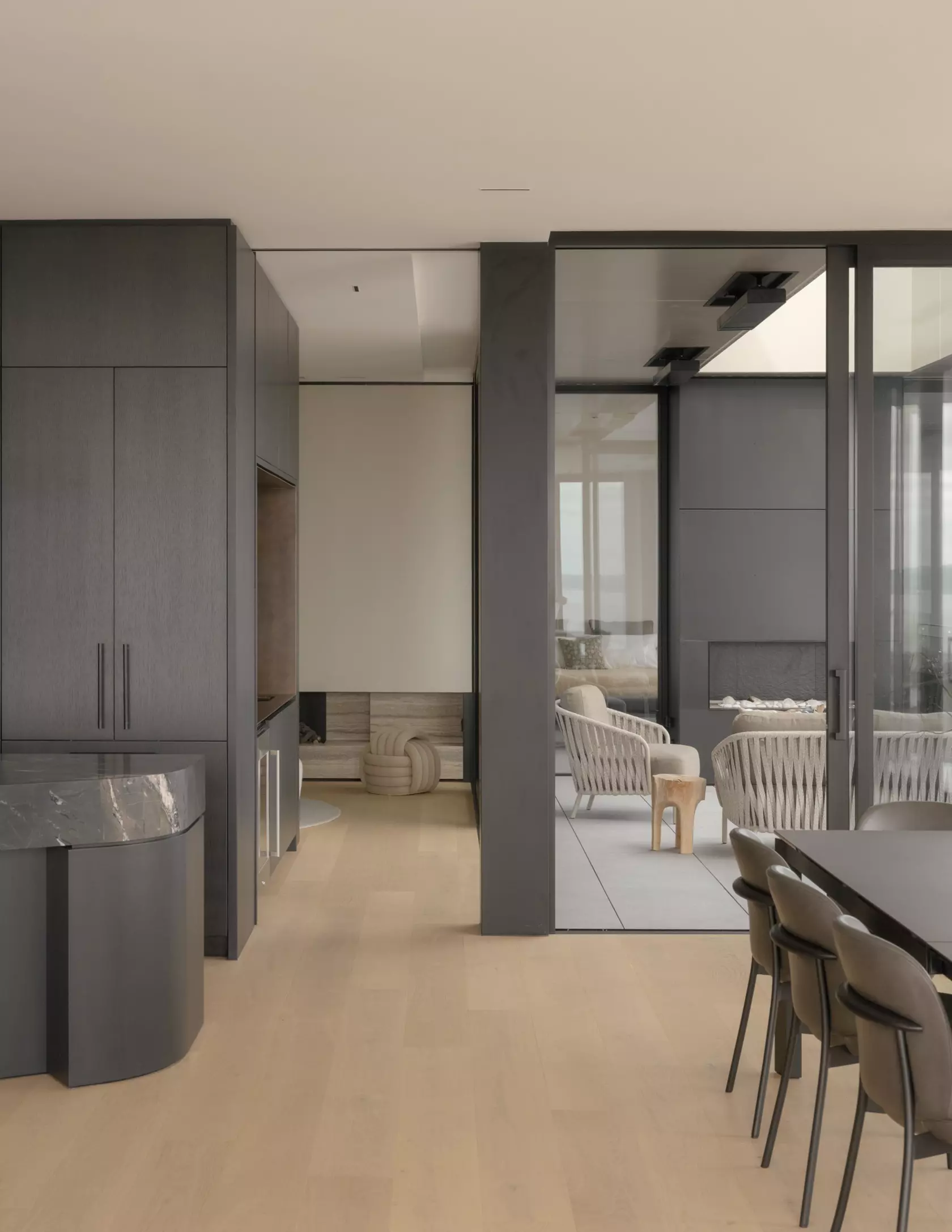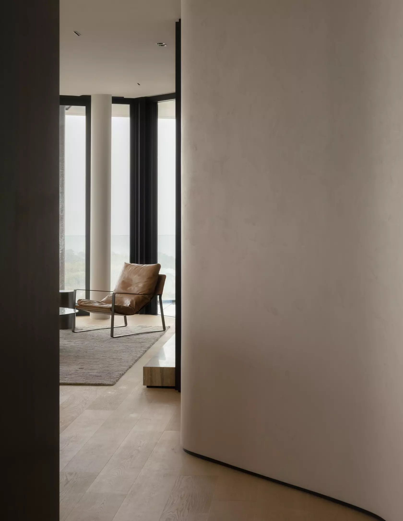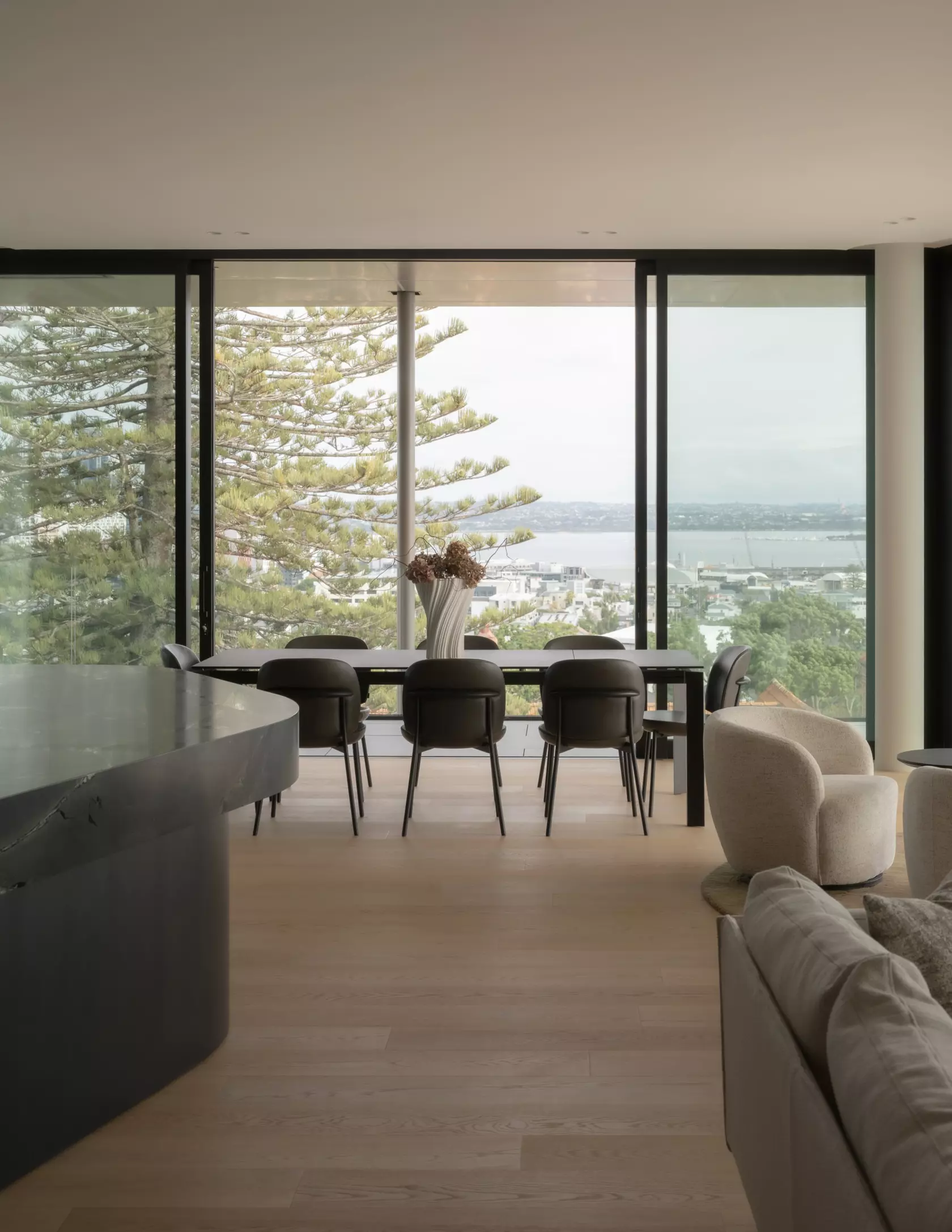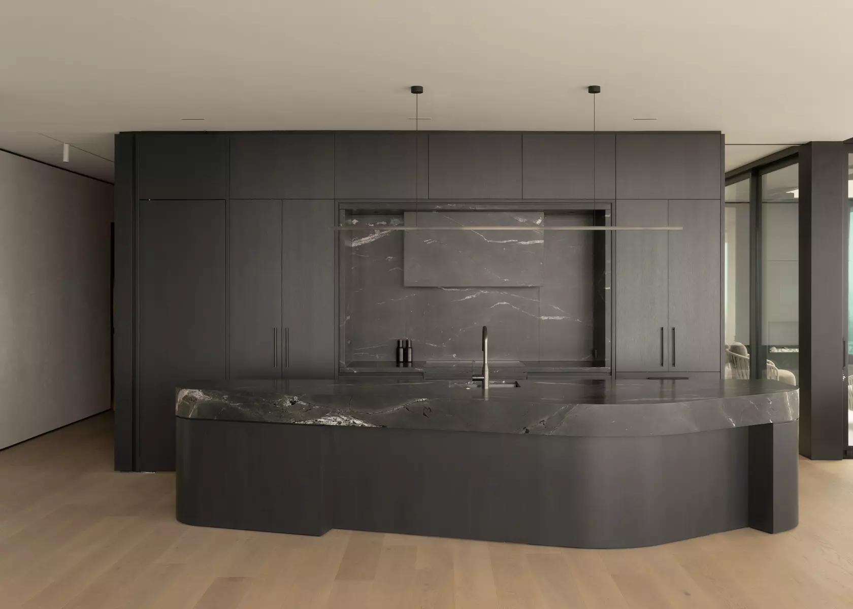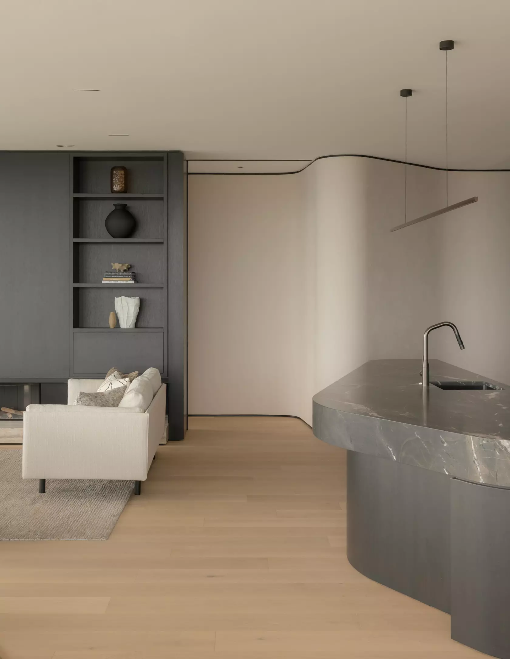 Inside, the strategy shifts to a smooth, eye-guiding flow. "We wanted the space to read very horizontally so that these expansive views would be enjoyed from every room," says Elvidge. "So the joinery elements were objects within that horizontal field." Kitchens and feature walls employ organic geometries – curves and softened edges that let space feel fluid rather than segmented.