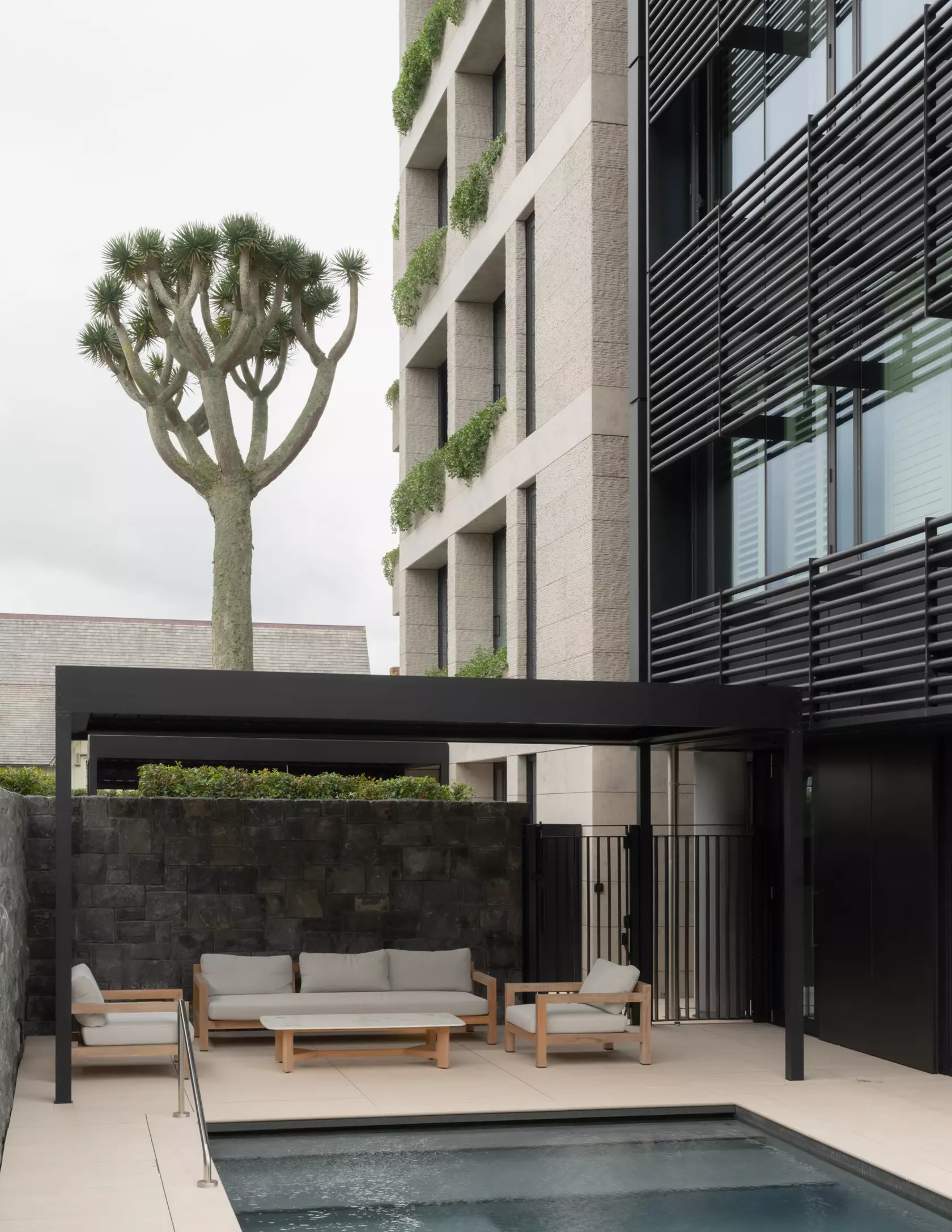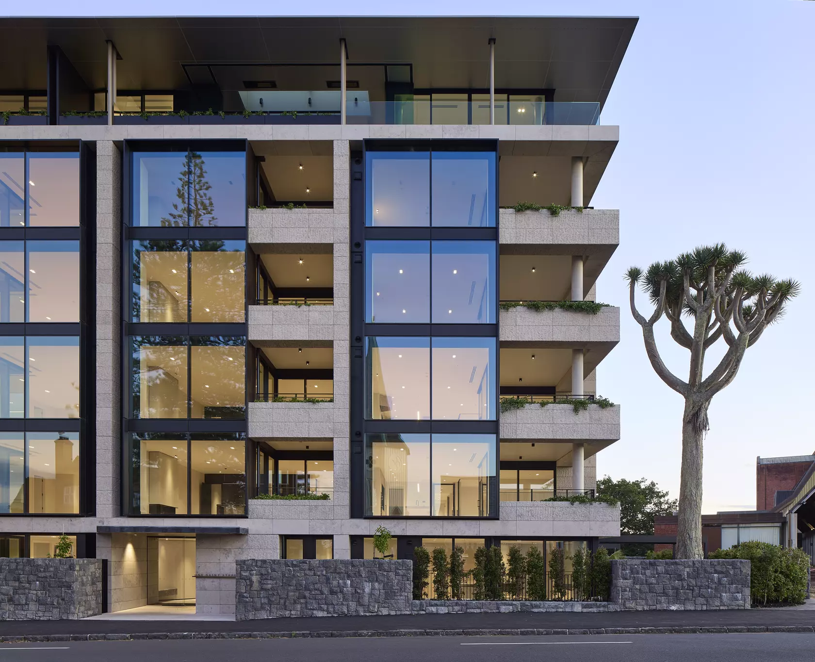 The building’s materiality does the heavy lifting in establishing its heritage context. The northern facade facing St Stephens Avenue is clad in limestone, a deliberate nod to the Portland stone of the Auckland War Memorial Museum. Deeply carved terraces provide both depth and privacy, preventing the building from reading as a flat wall of apartments. At the top, the penthouse level floats above the stone base, its fine roof edge adding visual interest at the skyline. Verdant planters soften the stone frame without undermining its solidity.