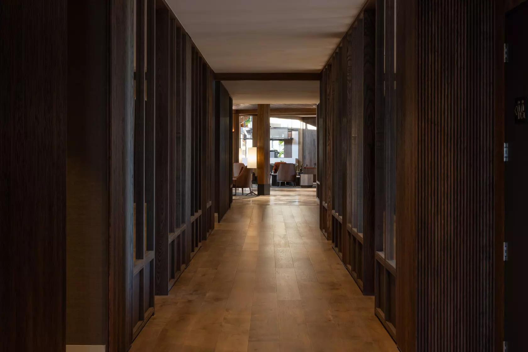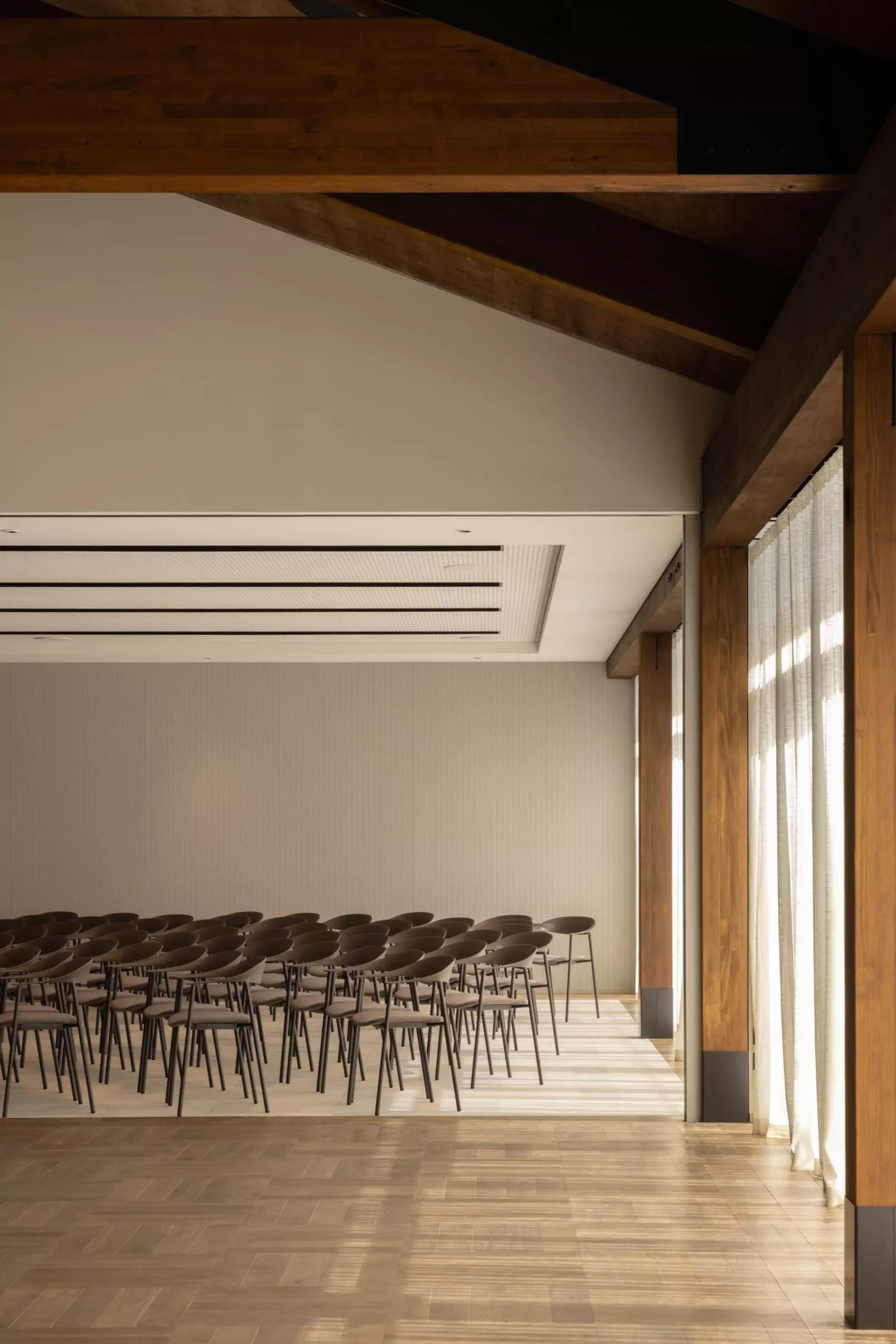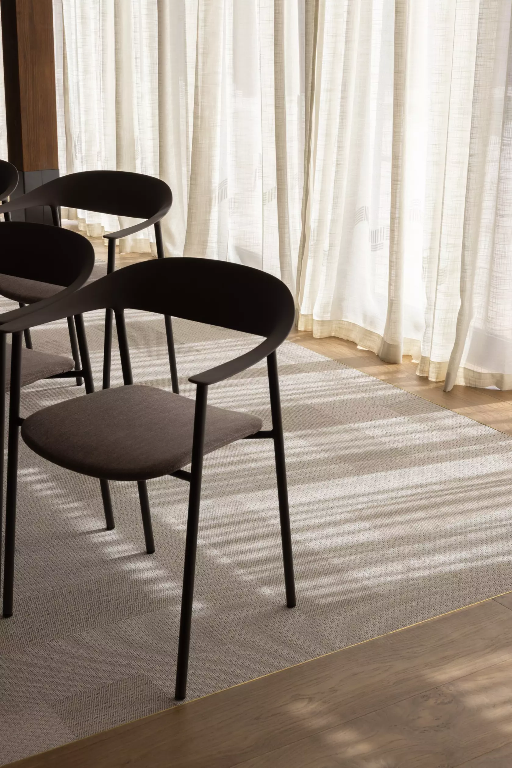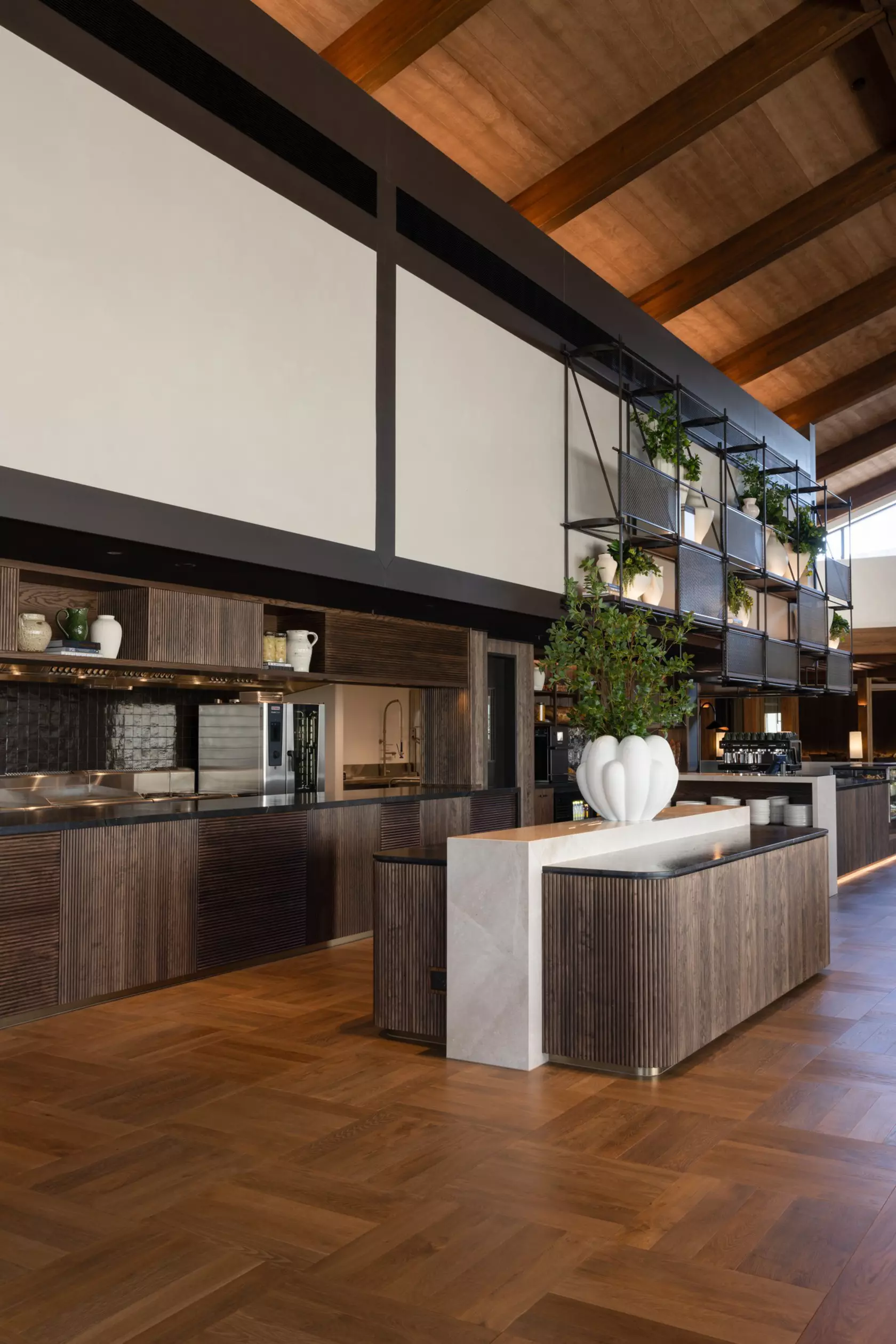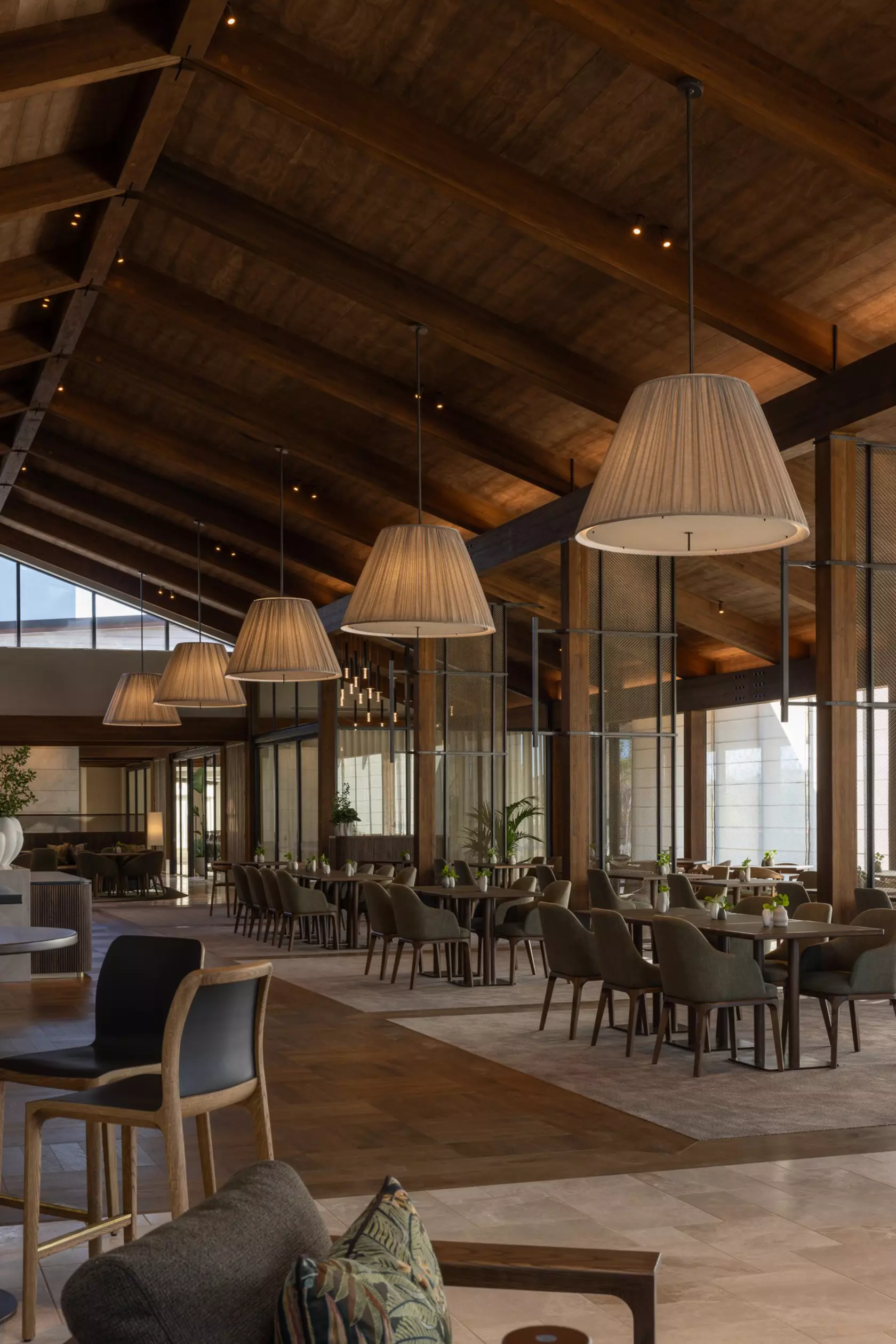 Oval rugs respond to how people actually move through space. A perpendicular timber ceiling detail at the entry does something more deliberate: "the space asks you to pause rather than push through." Within the larger volumes, scale is turned on itself. "Enormous lights and screens carve out intimate zones without fighting the architecture. The overall space reads as generous, but within it there are corners and clusters that feel human."