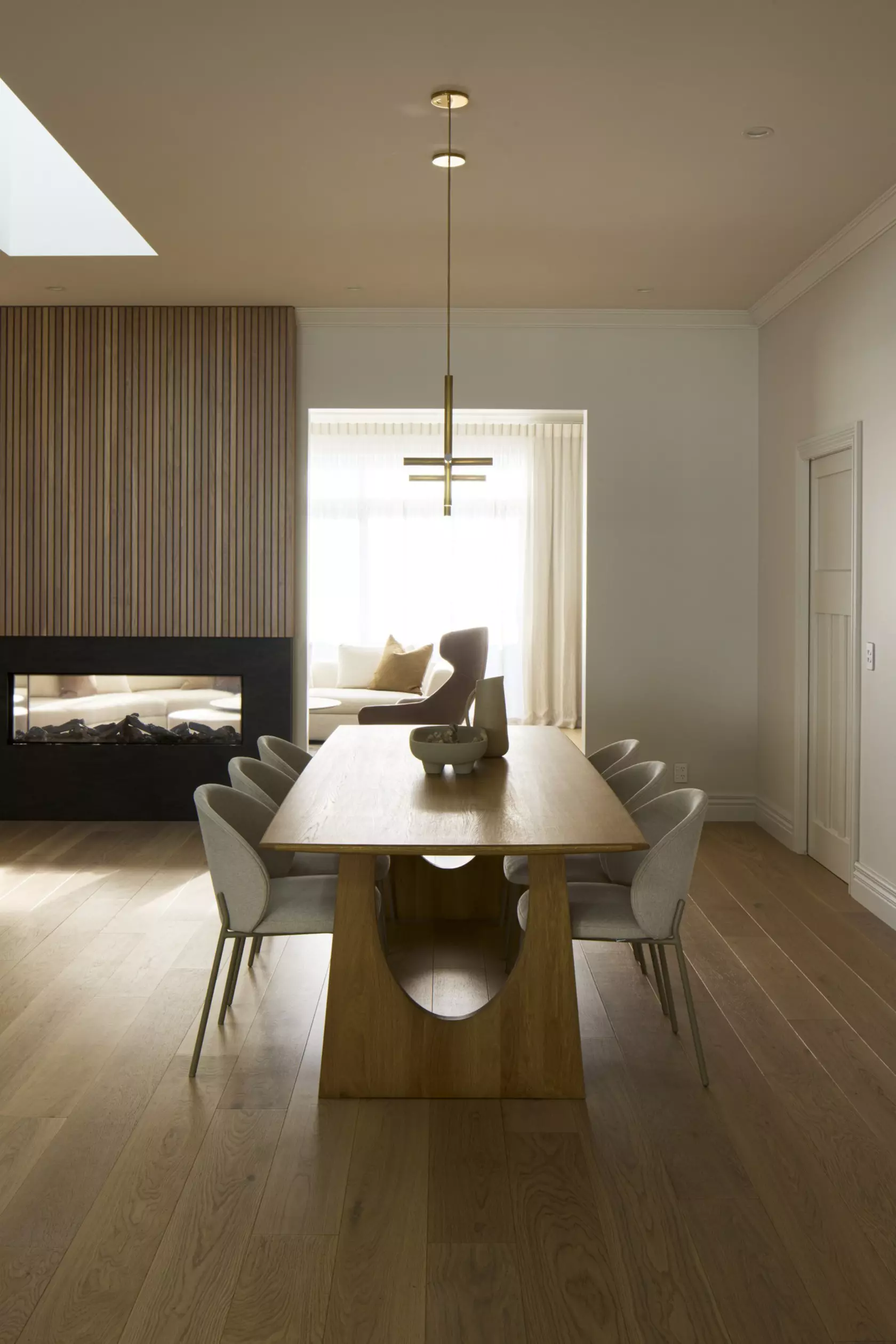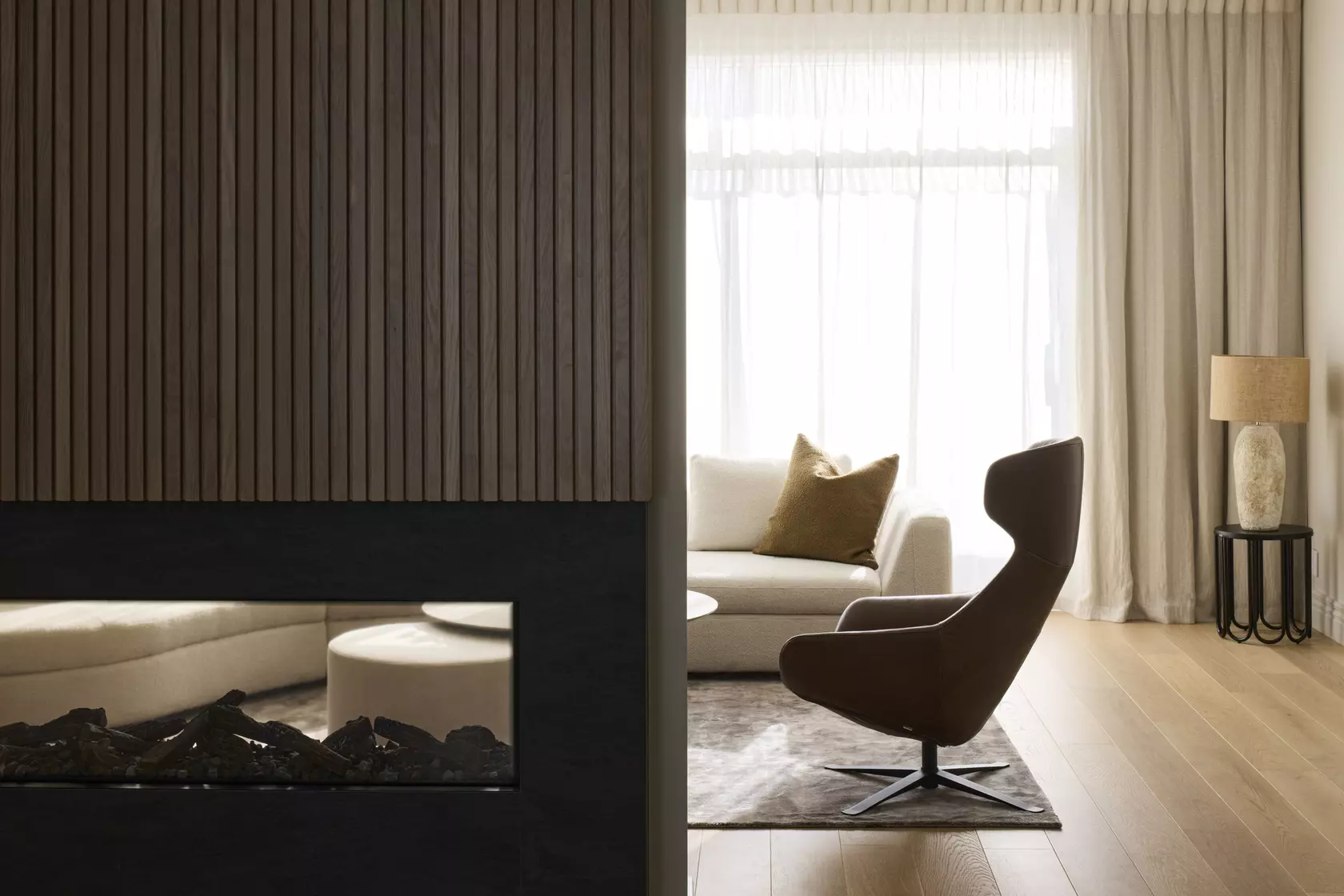 The curved lines of the sofa make a statement in the centre of the formal living space, wrapping the circular coffee table and ottoman. The large brass pendant hanging above and other carefully positioned lights provide a warm ambience and a cozy escape.