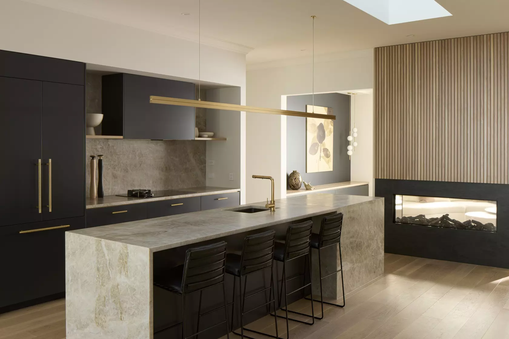 The darker cabinetry in the kitchen complements the deeper tones of the stone benchtop. These darker colours have also been used in some of the surrounding joinery accentuating the brass fittings and décor used throughout.