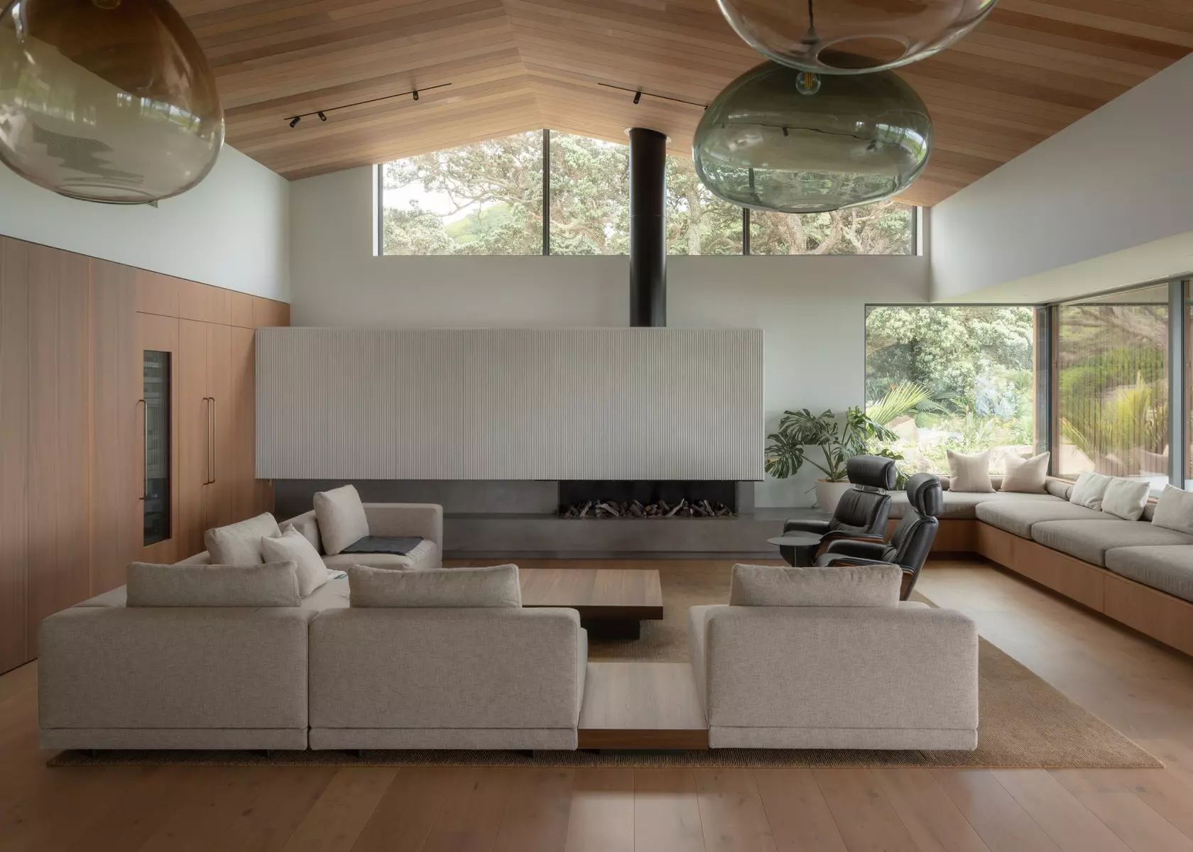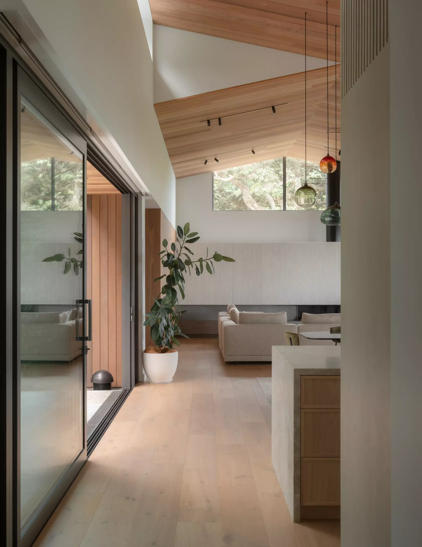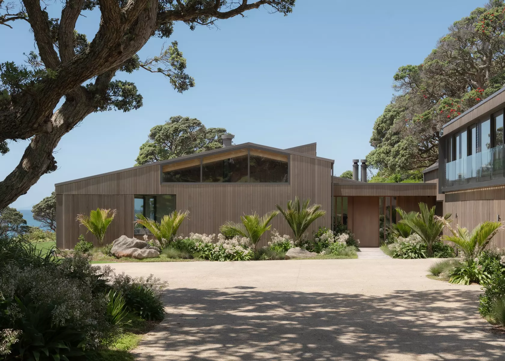 The existing pōhutukawa canopy — mature, irreplaceable, the defining character of the property — was protected throughout the build and integrated into the finished landscape. Native planting has been extended across the property, continuing a broader effort along the coastline to restore land to what it was before the pines arrived.