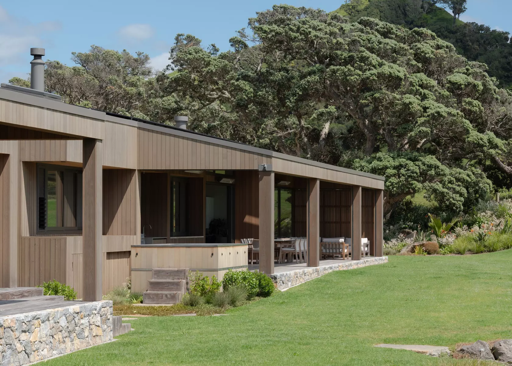 The stone used throughout the landscaping and pool surrounds follows the same logic. Rather than shipping schist from the South, Smith Construction sourced locally — from a quarry an hour to the north. "There's nothing sustainable about trucking your schist from Queenstown to Northland," Nick says plainly. "You should use the local resource of materials as much as you can." The result is hard surfaces that look as though they were always part of the site, because in a sense, they were.