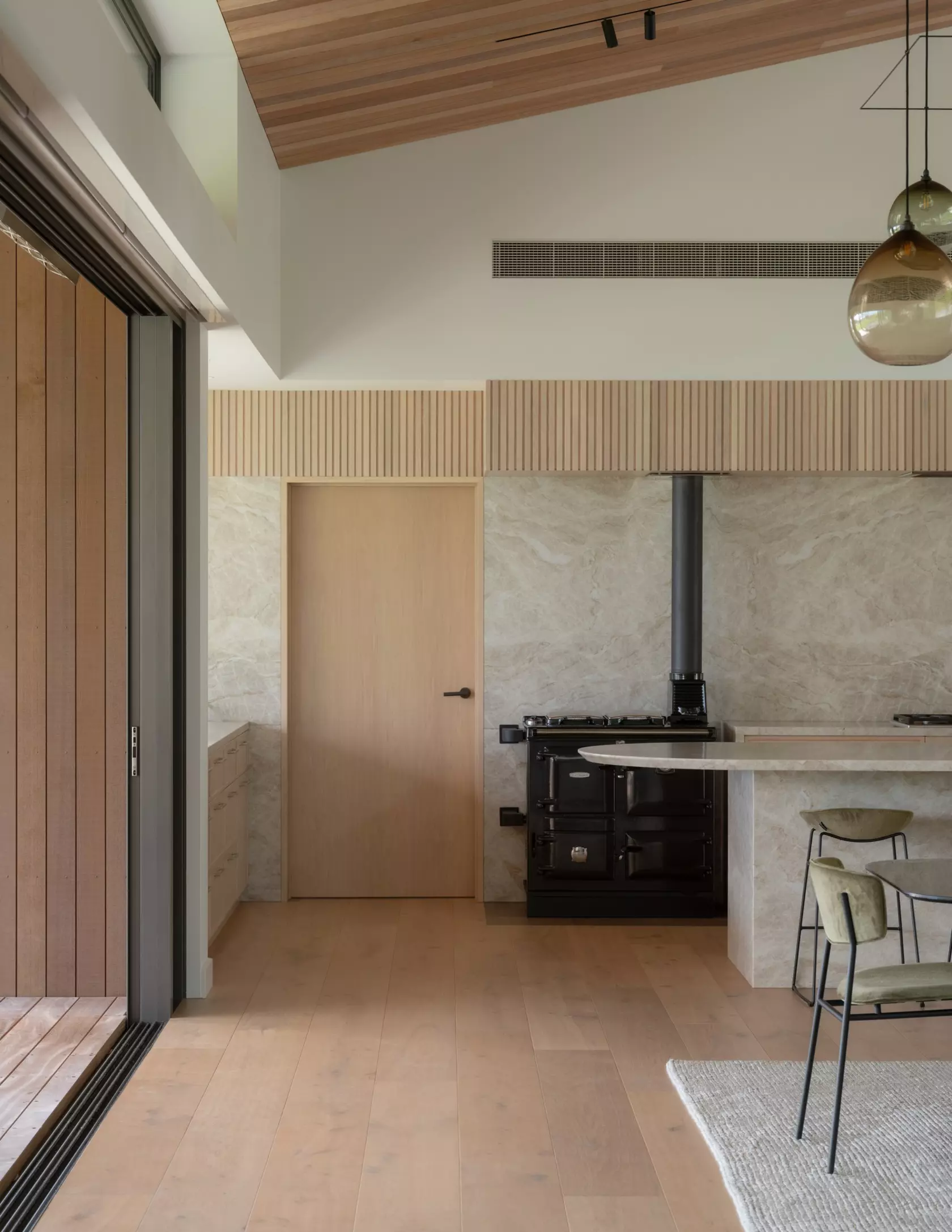The material palette is where the connection between building and landscape becomes most legible. Forté's Atelier Siltstone flooring was chosen not for its specification alone, but for the way it reads in context. "We were drawn to the coloration of the Forté Atelier Siltstone," Nick says. "The aged and rustic finish is sympathetic to the coastal environment around here and it tied everything in really nicely." The warm, weathered tone echoes the headland at low tide, the colour the coast takes on in late afternoon light — a material that doesn't compete with its surroundings but converses with them. Wide boards extend that quality through the interior, carrying the eye seamlessly between inside and out.