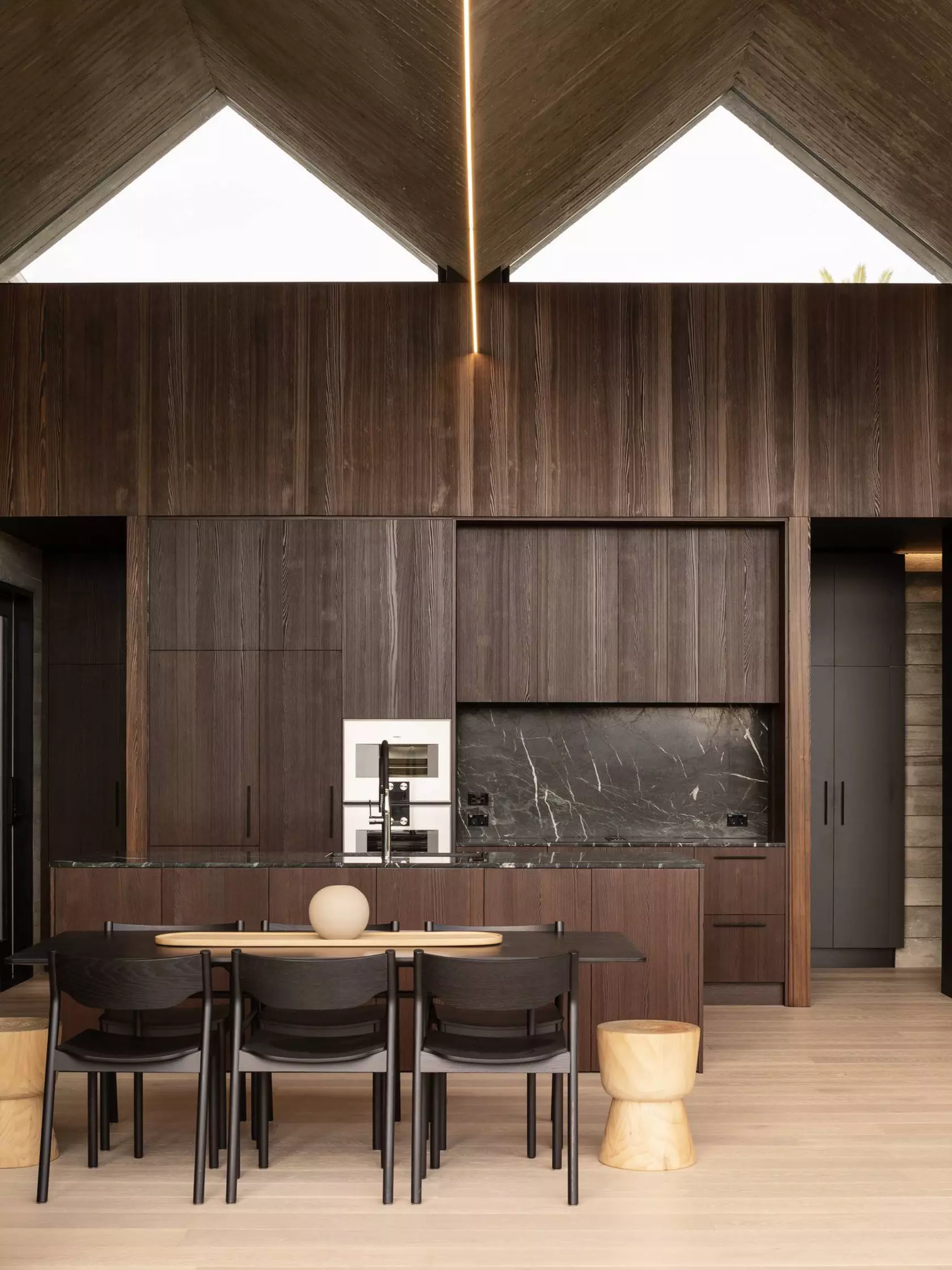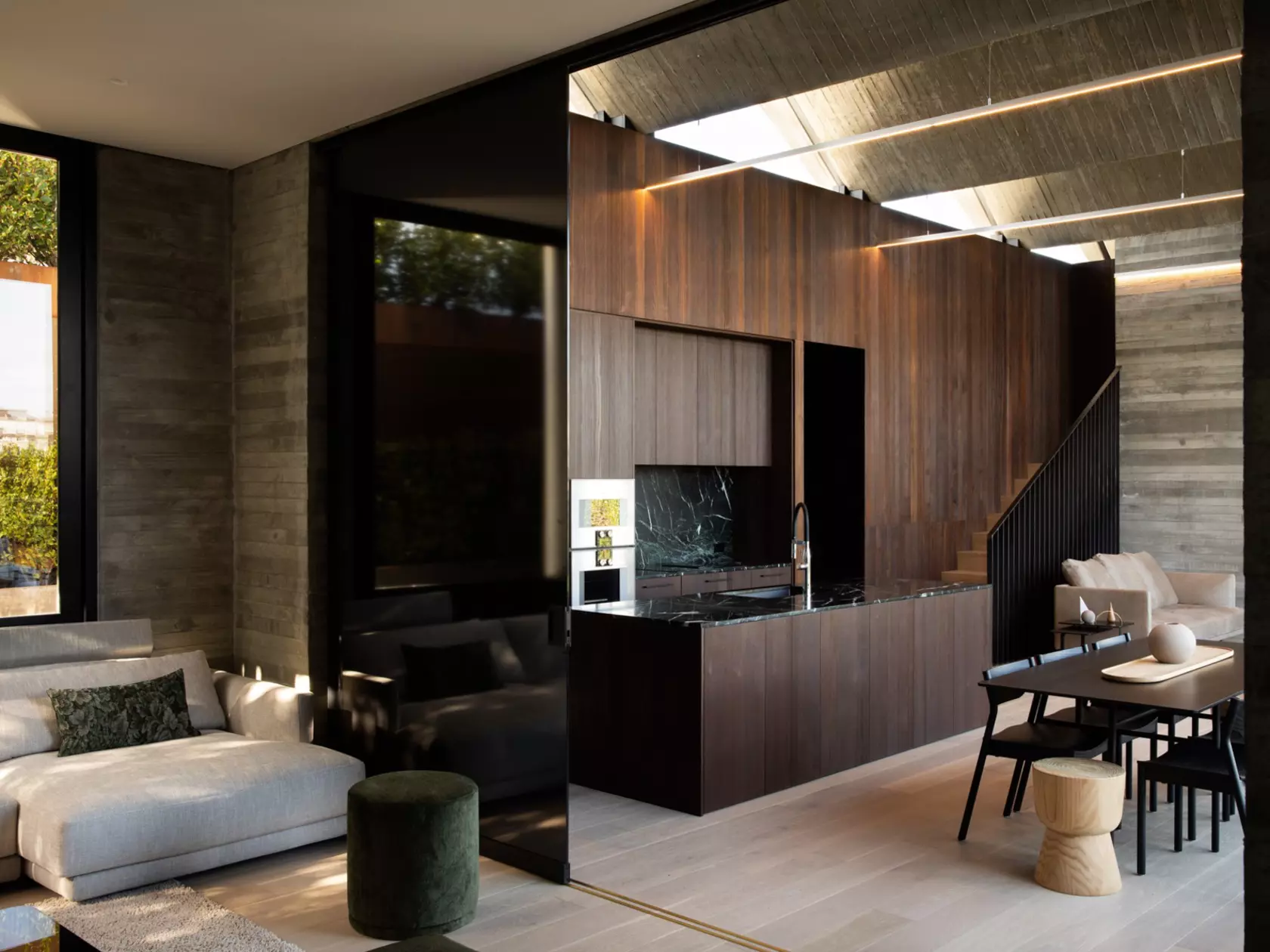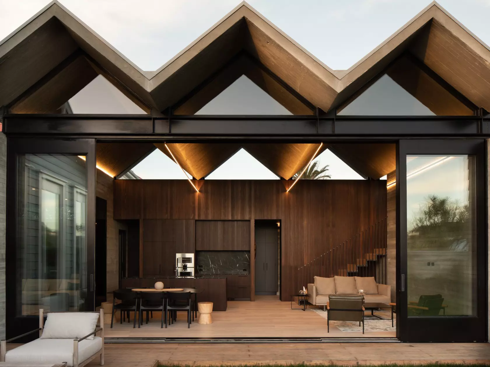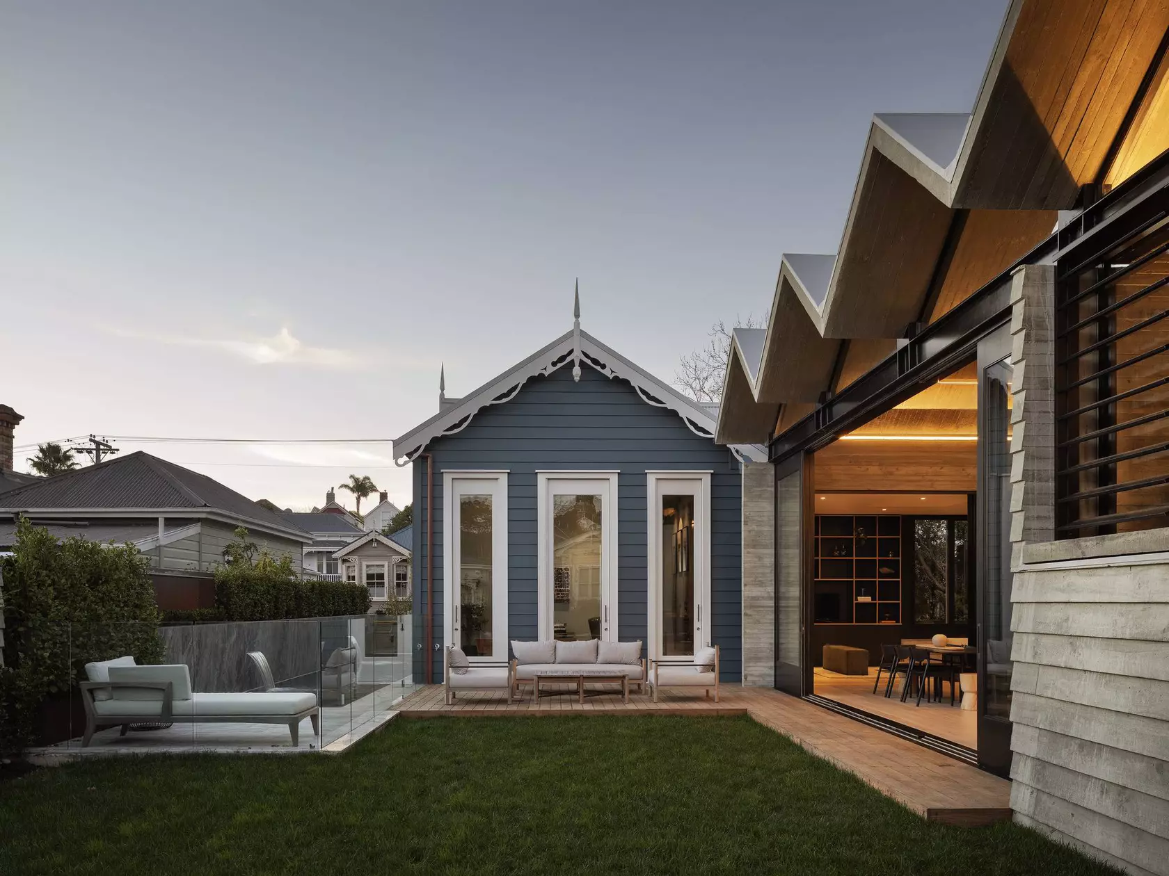 The pleated addition creates a dramatic social space that opens up to the garden, maximising natural light to the interior and providing a framed view of the suburbs beyond.