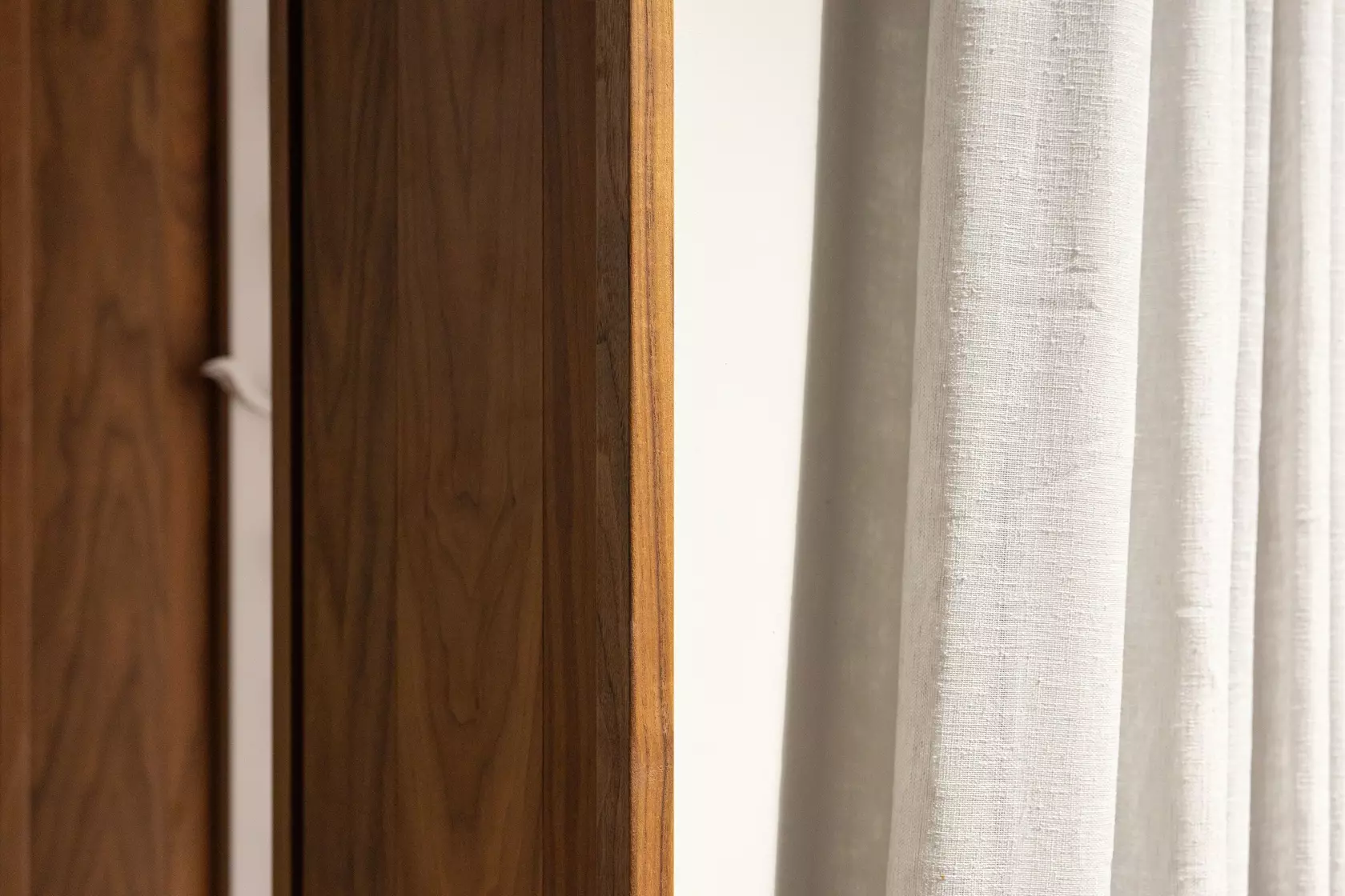 Tucked off to the side of a light-flooded dining area, a welcoming lounge offers a more retreat-like space, thanks in part to floor-to-ceiling panelling in Muuro Umber Walnut (now callled Muuro Sabel).