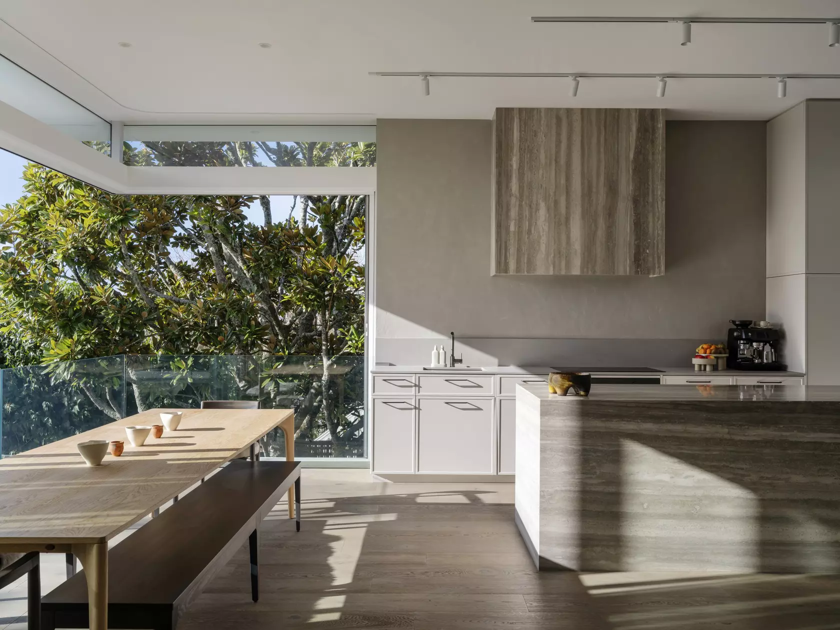 Set on a bush-clad site cascading to the water’s edge, this serene home is a modern retreat that embraces its coastal outlook while remaining firmly connected to community roots.