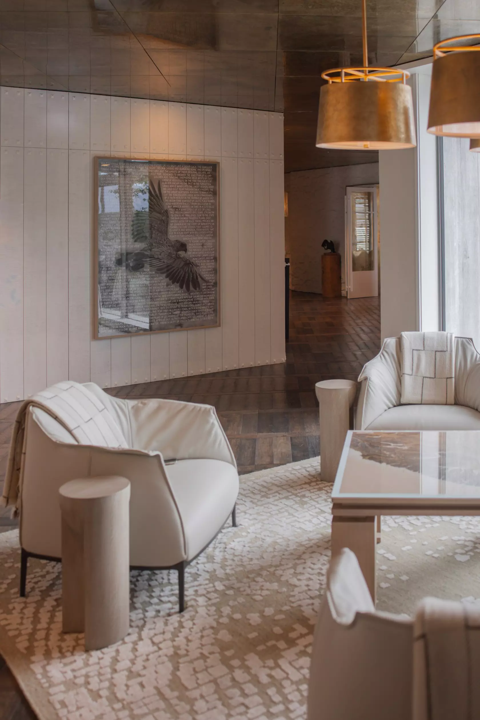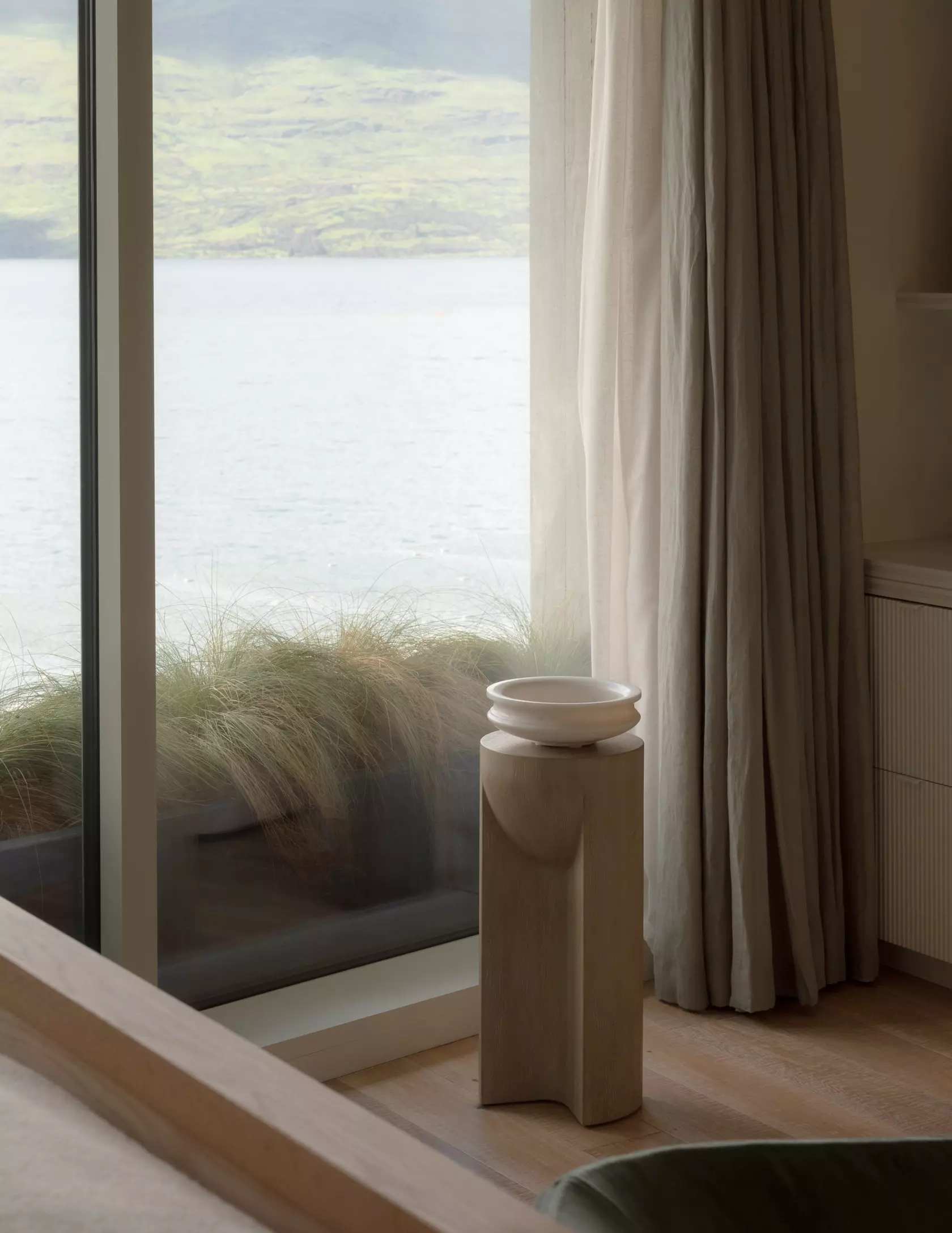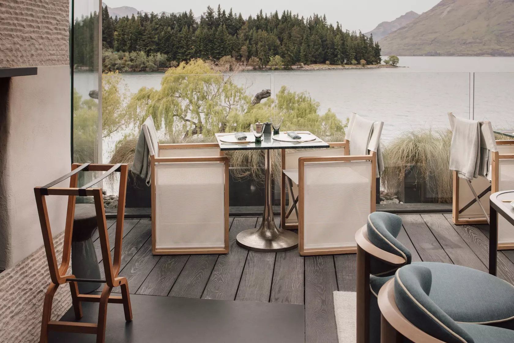 The project brought together two of New Zealand's most respected design practices. Sumich Chaplin Architects led the architectural vision for the five-level lakefront building, crafting a structure that frames the dramatic alpine landscape at every turn. Renowned interior designer Virginia Fisher was appointed to bring the interiors to life — and the result is unmistakably hers. Known for a classical design language that lets materials speak quietly but with conviction, Fisher curated a palette of hand-selected furnishings and finishes across the hotel's 15 luxury suites where nothing shouts and everything resonates. It is an approach rooted in restraint: warm, tactile, and deeply considered, where the landscape beyond the glass is always the hero, and every surface inside exists to honour it.