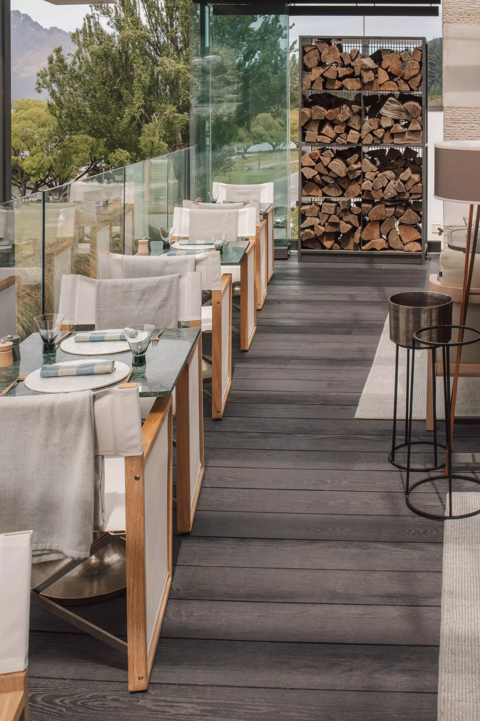 On the private balcony of the Grand Suite — the hotel's penthouse-level residence and most exclusive offering — Millboard Enhanced Grain in Limed Oak was specified. Its cool, pale tones complement the elevated panoramic views over Lake Wakatipu and the Remarkables, providing a refined outdoor extension that feels entirely at home among the suite's considered interior design.