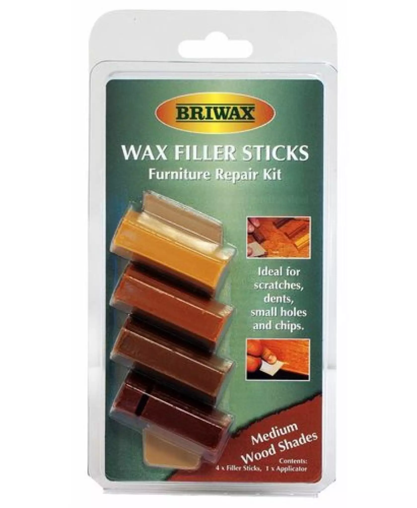 Pre-coloured wax filler sticks for repairing minor surface imperfections in timber flooring. Suitable for medium wood tones.